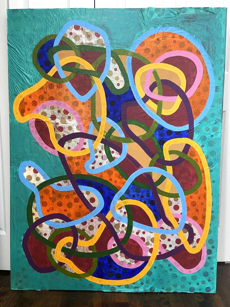 Pour ma plus récente Encerclée, j’y suis allée un peu fort avec 23 cercles. Ça fait du monde à messe ! La particularité de cette cinquième variation sur le thème du cercle est l’arrière-plan uniformément couvert de papier de soie à imprimé de pastilles.