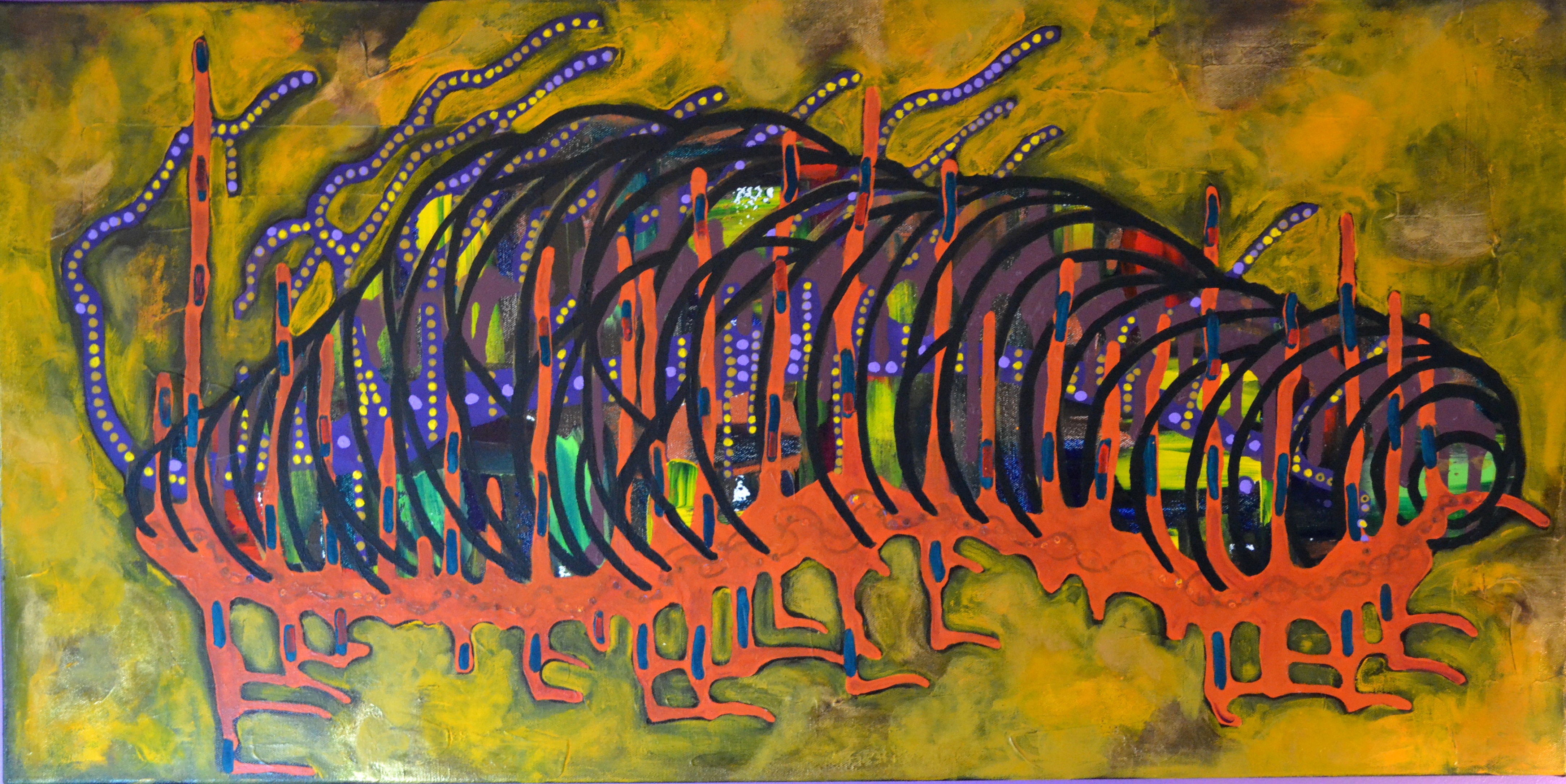 Rendue à la troisième toile, j’ai fait couler du orangé, et aussi de la couleur bourgogne, j’ai tracé un motif de lignes enlacées dans l’orangé, que j’ai ensuite essayé d’effacer. Un matin, je me suis levée et je me suis dit, regardant la toile en chantier : Ce sera une chenille. Le soir, j’ai tracé les cercles noirs et le reste a suivi assez facilement.