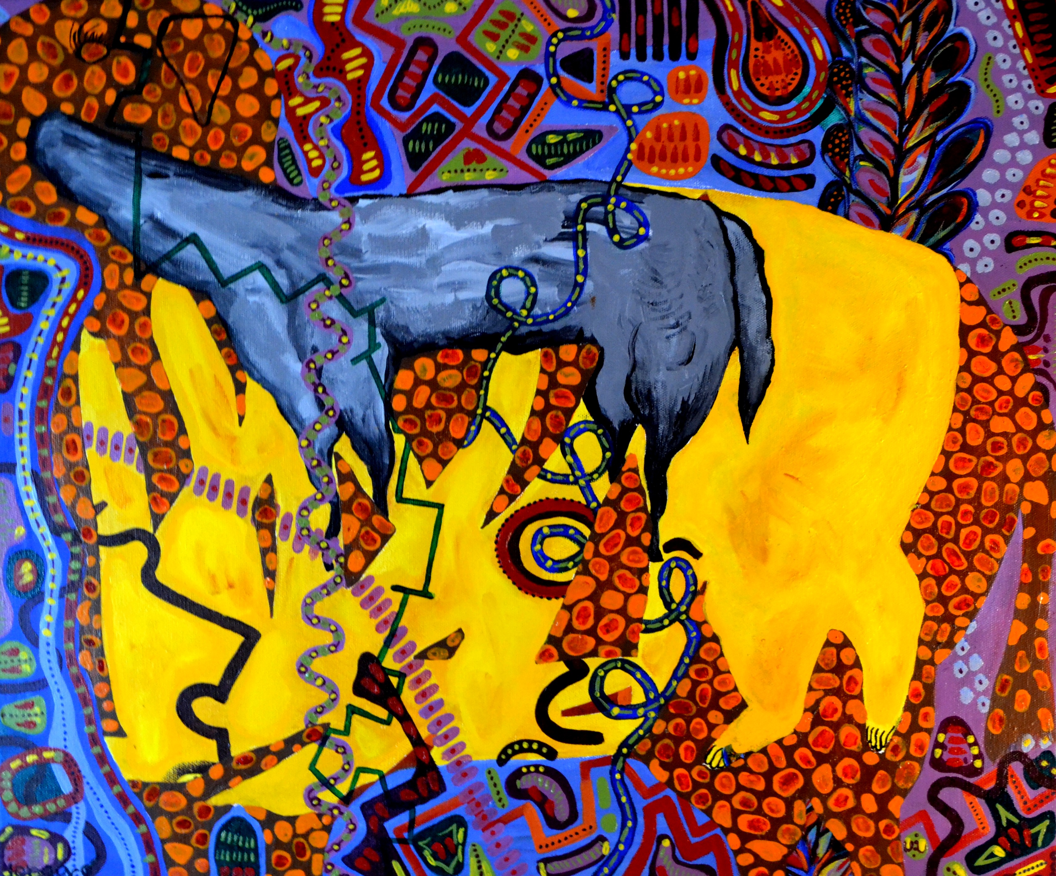 Il y a donc dans cette toile, d’inspiration autochtone selon Clovis, remplie à souhait comme la plupart de mes toiles, un quadrupède mi-vache mi-mouton à peau tachetée qui couvre une bonne partie de la surface. Il se tient tellement raide qu’on peut penser qu’il n’a jamais bougé de sa vie. Quand j’ai réalisé à quel point ce quadrupède était raté, j’ai voulu le couvrir d’une longue tige de pétales sombres sur lesquels j’ai travaillé longtemps avant de me rendre compte que cette tige était aussi raide et ratée que mon animal à quatre pattes. C’est alors que j’ai inventé une grosse tache jaune pour cacher une partie de la tige. Je me suis amusée à tracer des orteils aux extrémités des deux portions jaunes qui débordent de la tache. De fil en aiguille, j’ai modelé la masse jaune qui est devenue l’arrière-train d’un demi-ours. L’existence d’un loup marmotte fait l’unanimité en ce sens que l’on reconnaît la présence d’un animal gris et noir (à queue de renard), même si l’espèce reste à définir.