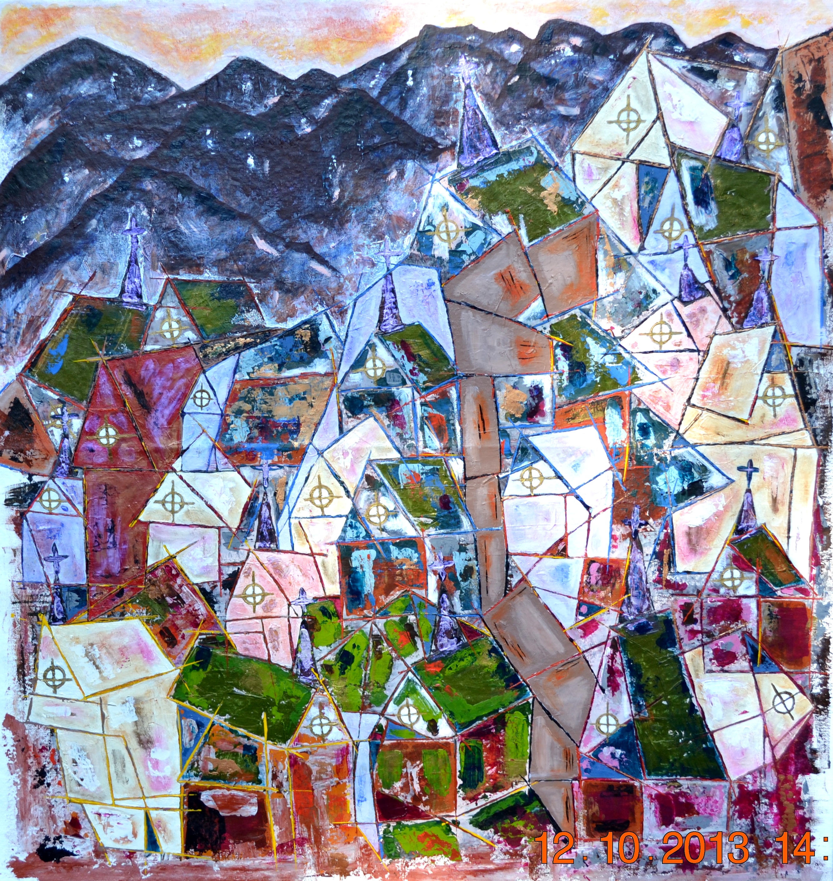 Hum… le choix de lettres se rétrécit. Ayant attribué 14 lettres de l’alphabet à 14 toiles, il ne reste que 12 lettres, parmi lesquelles les K, Q, U, W, X, Y, Z, qui ne sont pas faciles à utiliser. Je pourrais y aller pour Quand une église n’attend pas l’autre, ça me débarrasse du Q, mais ça ne finit pas en é. La première idée qui m’est venue est Funiculaire avorté, parce que la partie brune qui traverse l’œuvre se veut une esquisse de funiculaire, mais je n’ai pas eu le cœur de brunir la belle surface blanc cassé de l’église la plus surélevée, alors le funiculaire parcourt la toile sans se rendre jusqu’en haut, il se termine sous une toiture, ce n’est pas idéal. Chapelles sur flanc escarpé, voilà, j’ai trouvé. D’ailleurs, ce sont effectivement des chapelles, directement inspirées de celle qu’il y a à côté de chez moi à la campagne, qui a pour nom Notre-Dame-de-Fatima, à St-Alphonse-Rodriguez. Et la lettre C était libre.