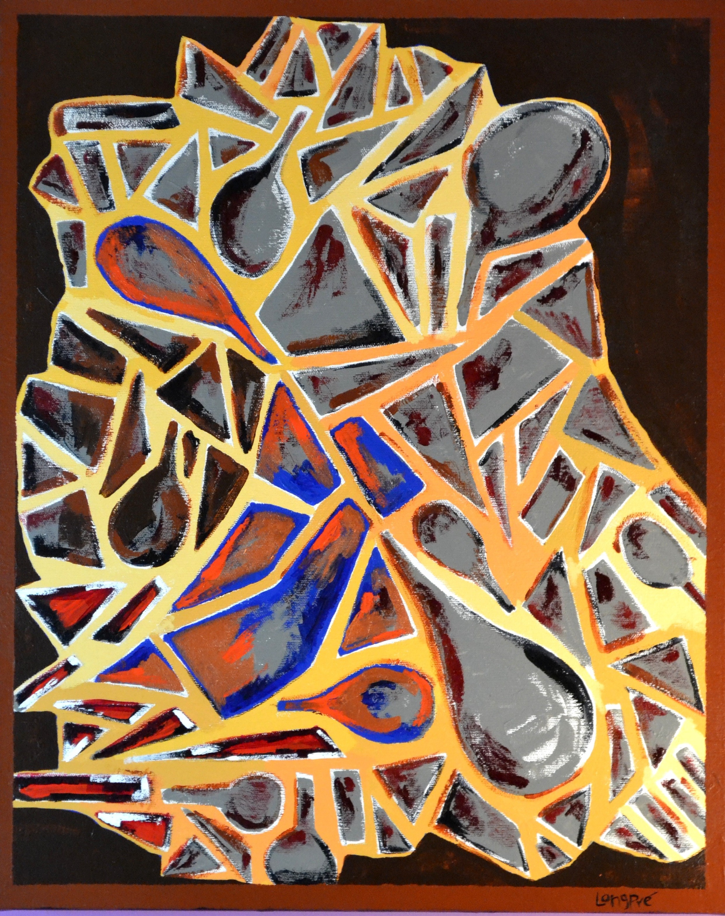Ayant présenté 19 toiles à ce jour, le choix alphabétique s’est excessivement resserré, d’autant que j’ai besoin aujourd’hui de deux lettres à la suite l’une de l’autre, il n’y a que W et X. Ce sera facile car sur le premier tableau on voit, là où il y a des teintes d’orangé et de bleu, ci-contre, un personnage agenouillé qui semble porter un kimono, ou alors une tenue asiatique qui vient avec un obi noué dans le dos. Je vais donner au personnage un prénom japonais qui commence par W. Pour le deuxième tableau, facile aussi, on dirait un masque africain, alors ce sera le prénom d’un guerrier protecteur de tribu qui commence par X.