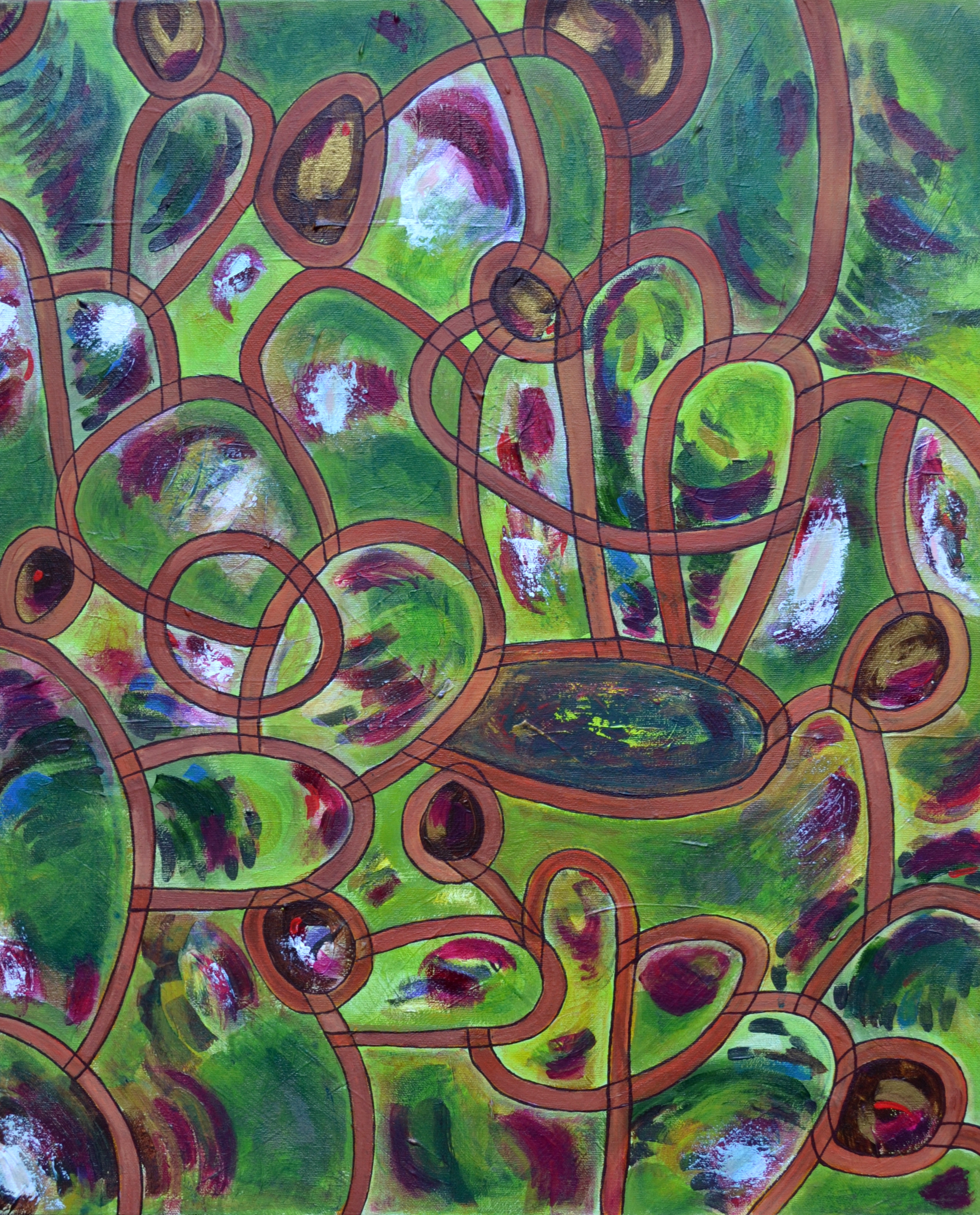 Fiou ! Ce ne sera pas facile aujourd’hui. Je présente la première toile d’un triptyque dont le titre doit commencer par la lettre K. Tante Alice, maintenant décédée, me disait y voir un ameublement de jardin, en particulier une chaise en fer forgé –là où se trouve la surface oblongue plus foncée à peu près au centre de l’œuvre. Les formes circulaires, les semblants de pétales, les courbes en forme d’arches constituent le thème commun aux trois toiles. Qu’est-ce qui commence par K à part Karina et Kayak et Karaté ? Qu’est-ce qui commence par K, se termine en é et peut avoir un lien avec la verdure du jardin ? J’ai travaillé sur le triptyque à St-Jean-de-Matha, en 2009, dans une grande maison voisine à celle de papa que François avait louée pour les vacances d’été. La nature fut luxuriante, cet été-là, parce qu’il a plu tout le temps. Pour cette raison, nous avons passé plus de temps dedans que dehors, mais aussi parce qu’il y avait trop de bateaux, et de bruit, sur le lac Noir. Je pouvais difficilement m’installer sur la terrasse pour peindre, les rares fois qu’il a fait beau, parce qu’elle n’était pas protégée du soleil, l’acrylique aurait séché et moi j’aurais brûlé. Les trois toiles sont une à côté de l’autre sur un des murs du corridor étroit, dans l’appartement de Montréal. On les voit bien quand on sort de la chambre d’Emma. Ce n’est certes pas une place de choix, mais il y a pire, je pense au diptyque de Barcelone qui est caché derrière un rideau. Tiens, tout d’un coup j’ai trouvé, ce sera Kyrielle de jours d’été.