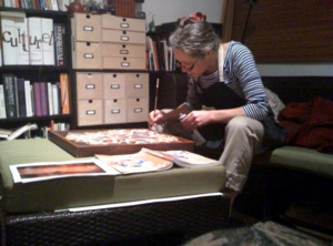 À l’instar de mon triptyque, cette avant-dernière toile –dont le titre m’est venu hyper facilement à l’instant– date elle aussi du temps de François. Je portais souvent mes pantalons GAP et mon chandail de coton rayé bleu et blanc, dans cette période-là, comme en témoigne la photo ci-dessous sur laquelle on me voit à l’oeuvre, peinant sur Wakiko agenouillée. Je pense que François, hormis me photographier, était en train de préparer le souper. J’ai les cheveux longs, non teints. Je porte mon ancienne monture de lunettes, dans la mesure où je viens d’en changer la semaine passée. Je n’avais alors pas mal aux pieds et l’obligation de porter des orthèses. Ce n’est peut-être pas le cas sur la photo, mais je me rappelle que j’aimais porter mes jolies bottines noires avec ce pantalon. Je pourrais encore les porter, sans les orthèses cependant car les bottines sont étroites et ajustées. Cela veut dire que j’aurais mal aux pieds et absolument pas envie de marcher. Donc, je ne les porte pas.