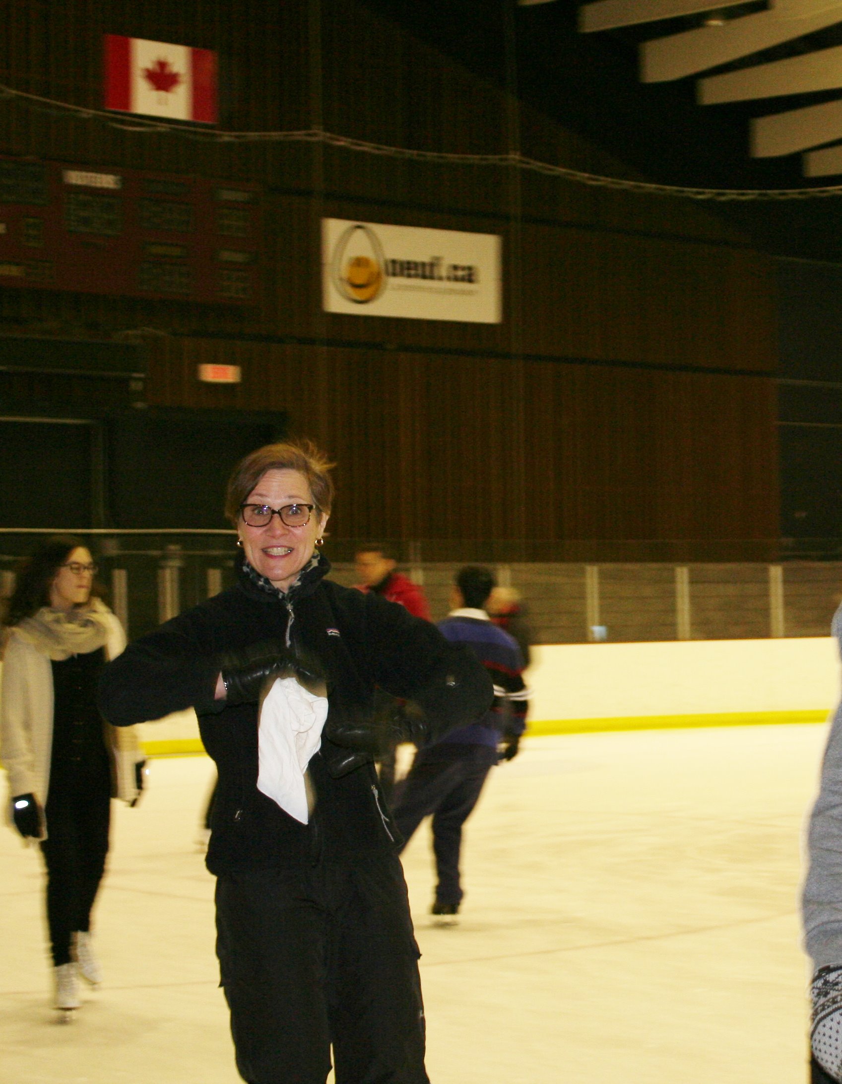 Étant donné que la communauté universitaire est un univers où nous entrelaçons les contacts et les relations, un autre collègue, ancien celui-là, m’a prise en photo juste avant que je fonce dans une jolie jeune fille en robe noire. Boum. J’étais habillée en noir aussi, portant les pantalons que Bibi m’a donné et une veste Columbia que j’ai achetée il y a peut-être quinze ans. Pour me protéger les mains des lames tranchantes des patineurs, des fois que je tomberais et qu’affalée de tout mon long mes doigts seraient offerts en pâture, je porte les mitaines que Clovis m’a offertes. Je traîne un mouchoir blanc de François en coton, comme quoi je ne mens pas quand j’affirme en avoir presque toujours un sur moi. Je me réchauffe le cou, enfin, avec un foulard à imprimé tacheté, acheté 1$ au Village des valeurs peu de temps après m’être séparée de Jacques-Yvan en 2007. Je ne peux presque rien dire de la robe noire de la patineuse pour ne l’avoir vue que trois secondes, mais au moment de la collision j’ai remarqué que la jeune femme, souriante malgré que l’on se soit rentrées dedans, portait avec poésie une fleur dans ses cheveux, près de l’oreille. Pas une vraie fleur, étant donné qu’il fait -28°C avec le facteur vent, mais une pince bijou en forme de fleur.