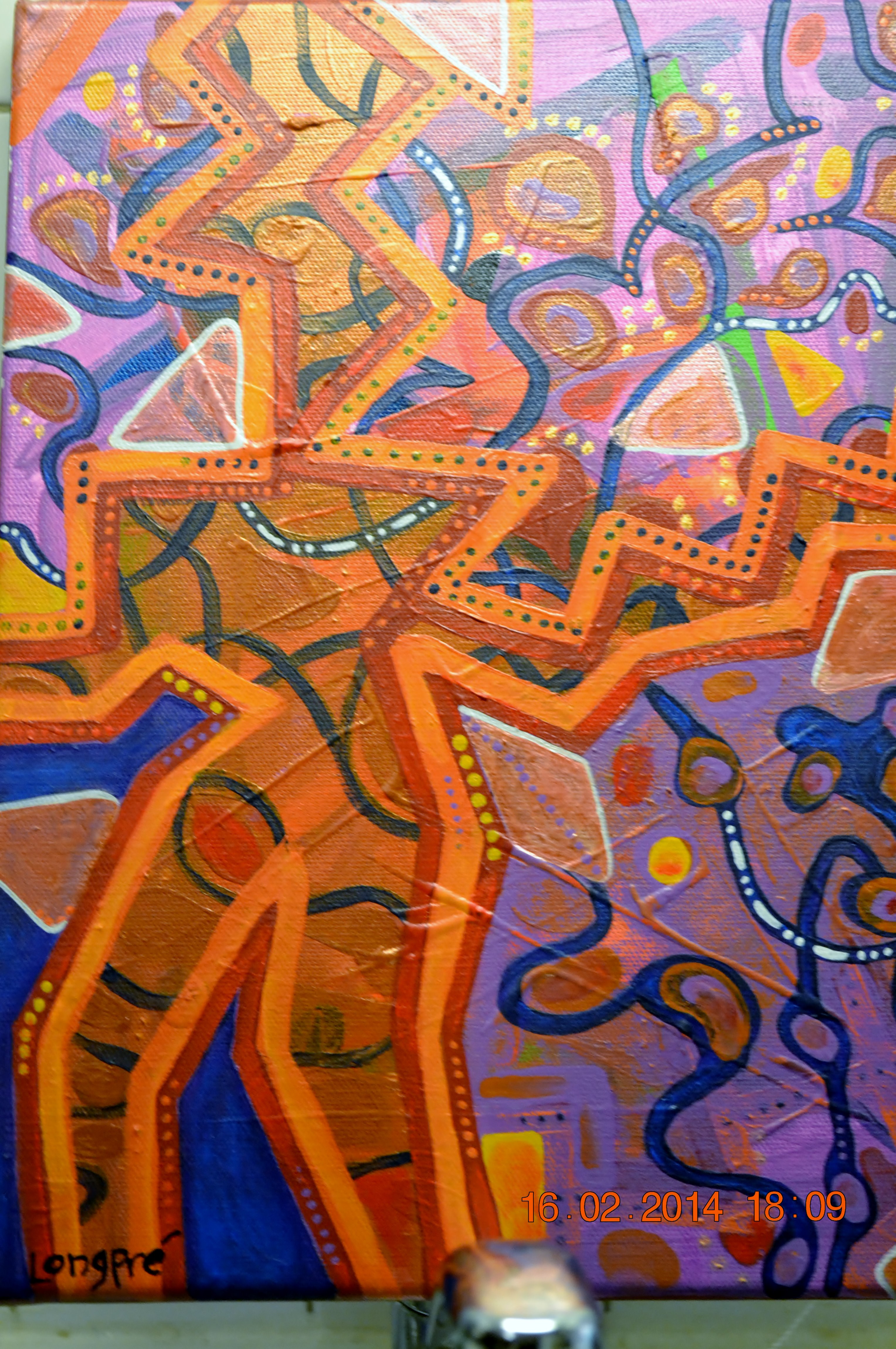 Je vous présente Robotisé, un nouveau membre de la série alpha. Il reçoit trop de lumière du flash de mon appareil photo, en haut, en plein visage finalement. Il est appuyé, en équilibre précaire, sur le robinet de l’évier, dans la cuisine. On aperçoit ma signature, de style bébé-la-la, en bas à gauche. J’exagère, bien entendu, puisque les bébés ne savent pas écrire. Apparaît également, à droite, la date de la prise de photo, à savoir aujourd’hui même. La date, faut-il le préciser, ne fait pas partie de l’œuvre. Robotisé vient remplacer, dans ma série alpha, la belle vache aux veines bleues qui apparaît sur la toile Rencontre inusitée dans le pré. Exceptionnellement, pour des raisons qu’il serait trop long de détailler ici, j’ai vendu et remis à l’acheteur, avant la fin de mon exposition, la toile de la lettre R. L’acheteur est un collègue de l’université, alors pour faire simple, étant donné que nous travaillons dans des pavillons éloignés l’un de l’autre, la belle vache a voyagé dans une enveloppe matelassée par le réseau de courrier interne. Jamais on n’imaginerait la chose possible s’il s’agissait d’un Matisse, ou d’un Renoir, ou d’un Besner, mais justement, un Longpré peut voyager sans problème dans une enveloppe matelassée. Je ne pense pas avoir écrit sur l’enveloppe, en outre, une notice de style Manipuler avec soin, Fragile. Robotisé fait partie d’un triptyque. Il ne se sent pas seul, bien qu’extirpé de sa famille d’origine à la campagne, où, avec son frère et sa sœur, il partageait le même mur depuis deux ans. Il ne se sent pas seul puisqu’il est maintenant entouré de Quelque chose qui donne envie de danser, à gauche, et de Superposés, à droite.