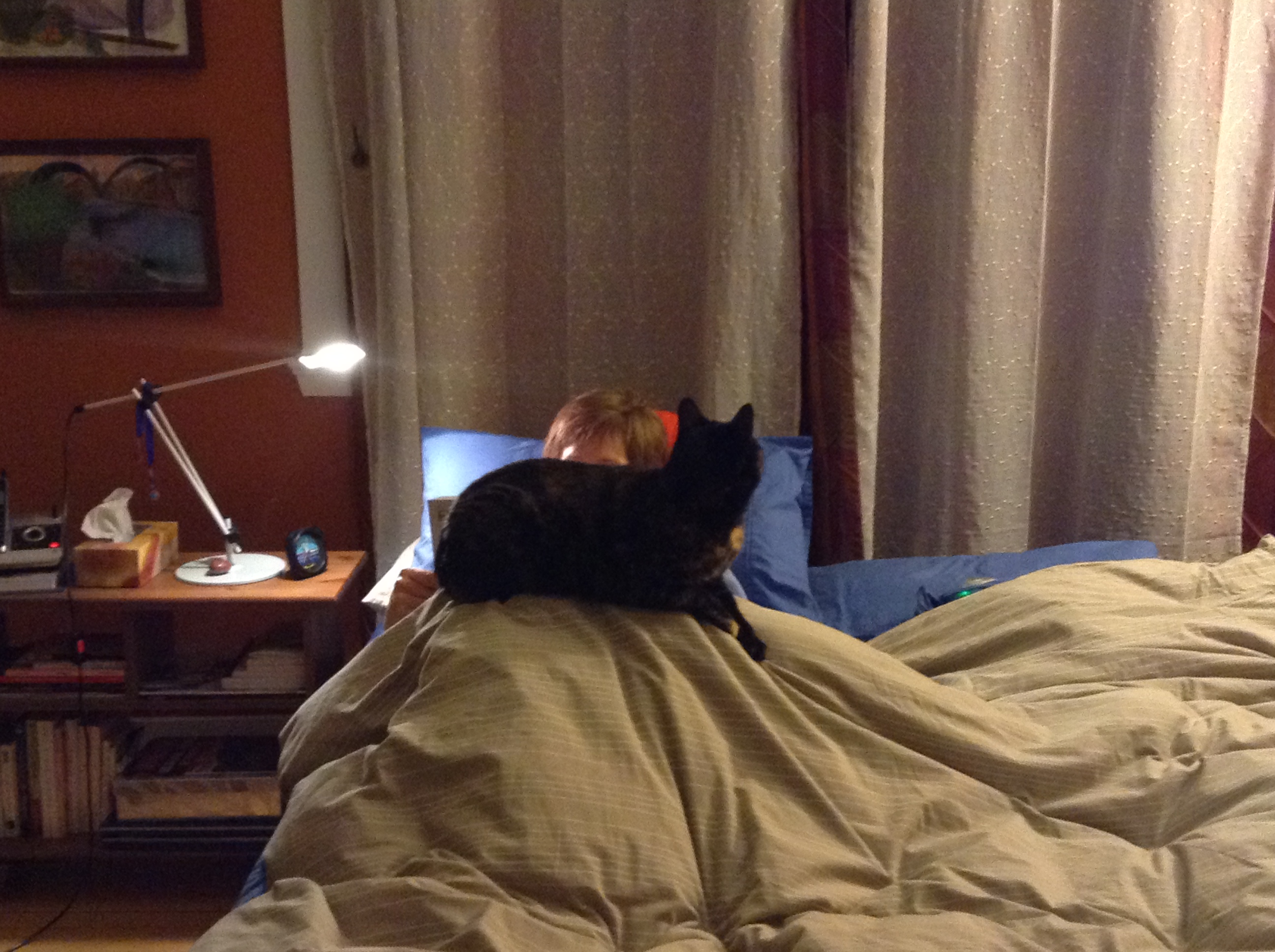 Est-ce que les chats perçoivent les couleurs aussi bien que nous? Les images fixes? Je ne crois pas. Ils ont des experts en vision nocturne, mais pas nécessairement en couleurs. Mais… il est vrai que c’était la nuit, ici, dans ta chambre. Cette photo a quelque chose d’extraordinaire. Encore une autre où tu te cachais. Heureusement que ce n’est plus toujours le cas 🙂