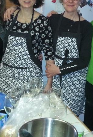 Par souci d’anonymat, je n’ai pas reproduit nos visages, ci-dessus. On comprend que Nicoletta est plus grande que moi, la photo s’arrête à sa lèvre supérieure alors qu’une portion importante de mon gros nez n’a pas été rognée. On remarquera également que Nicoletta attache son tablier dans le dos, et moi à l’avant dans un effet pascal d’oreilles de lapin.