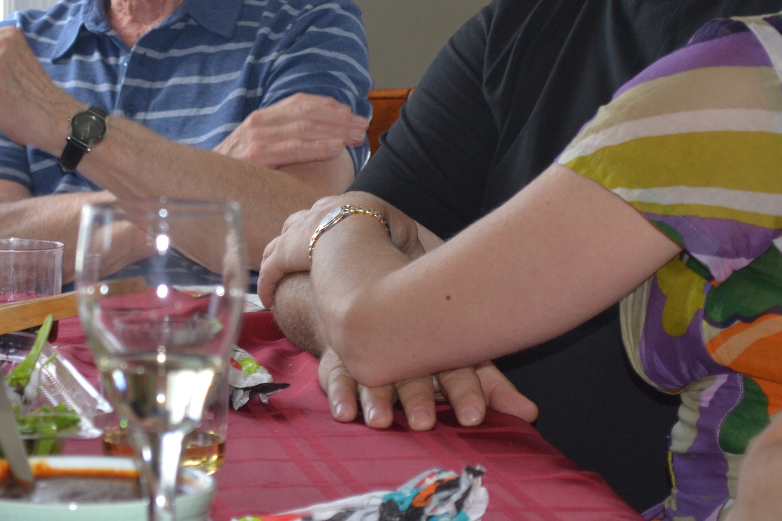 Encore ce matin m’en venant travailler j’ai trouvé un dix sous, américain cette fois. J’étais en train de penser à mon rendez-vous à la clinique de la vision quand je l’ai trouvé. En même temps que je pensais à mon rendez-vous à la clinique de la vision, que j’ai annulé pour y aller demain à la place, je ressentais de la douleur aux pieds. Je marchais avec des bottes trop grandes dans lesquelles mon pied glissait vers l’avant et se frottait à une couture à même le cuir. J’avais hâte d’arriver au métro et j’ai vérifié, trois fois plutôt qu’une, si un autobus n’allait pas bientôt se montrer, mais aucun autobus n’est venu à ma rescousse. Dans la liste des choses que j’ai à faire en octobre et qui constitue mon texte d’hier, j’ai oublié le rendez-vous de suivi de mes lentilles cornéennes multifocales. Je les portais quand j’ai pris des photos en fin de semaine, de Denauzier, et toutes les photos sont floues. Dommage car le sujet me plaisait, il s’agissait de nos pieds entrelacés. À défaut de pieds entrelacés, j’offre à mes lecteurs nos bras superposés.
