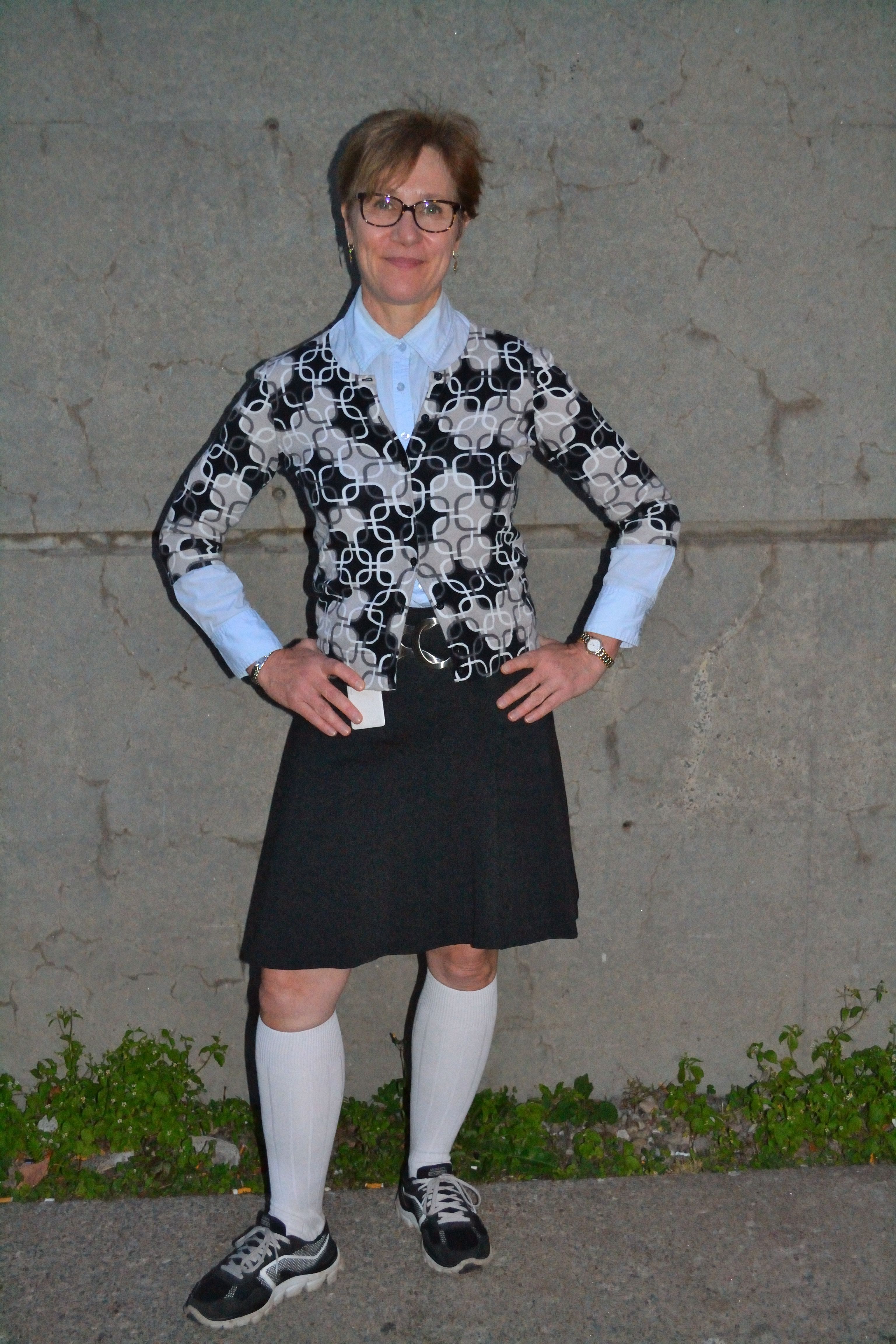 Par solidarité pour ma fille que j’aime tant, en clin d’œil à ses péripéties, par plaisir et pour le jeu, je me suis rendue hier à mon cours de photo avec des bas portés de la même manière, jusqu’aux genoux. J’ai demandé à une femme de mon cours si elle voulait me prendre en photo. Elle a accepté, nous étions en avance de dix minutes toutes les deux. C’est donc grâce à cette femme, grâce aussi à l’ami qui m’a donné les bas blancs qui appartenaient à son père décédé –travail d’équipe–, c’est grâce à la convergence d’un ensemble de facteurs, finalement, que j’apparais ci-contre.