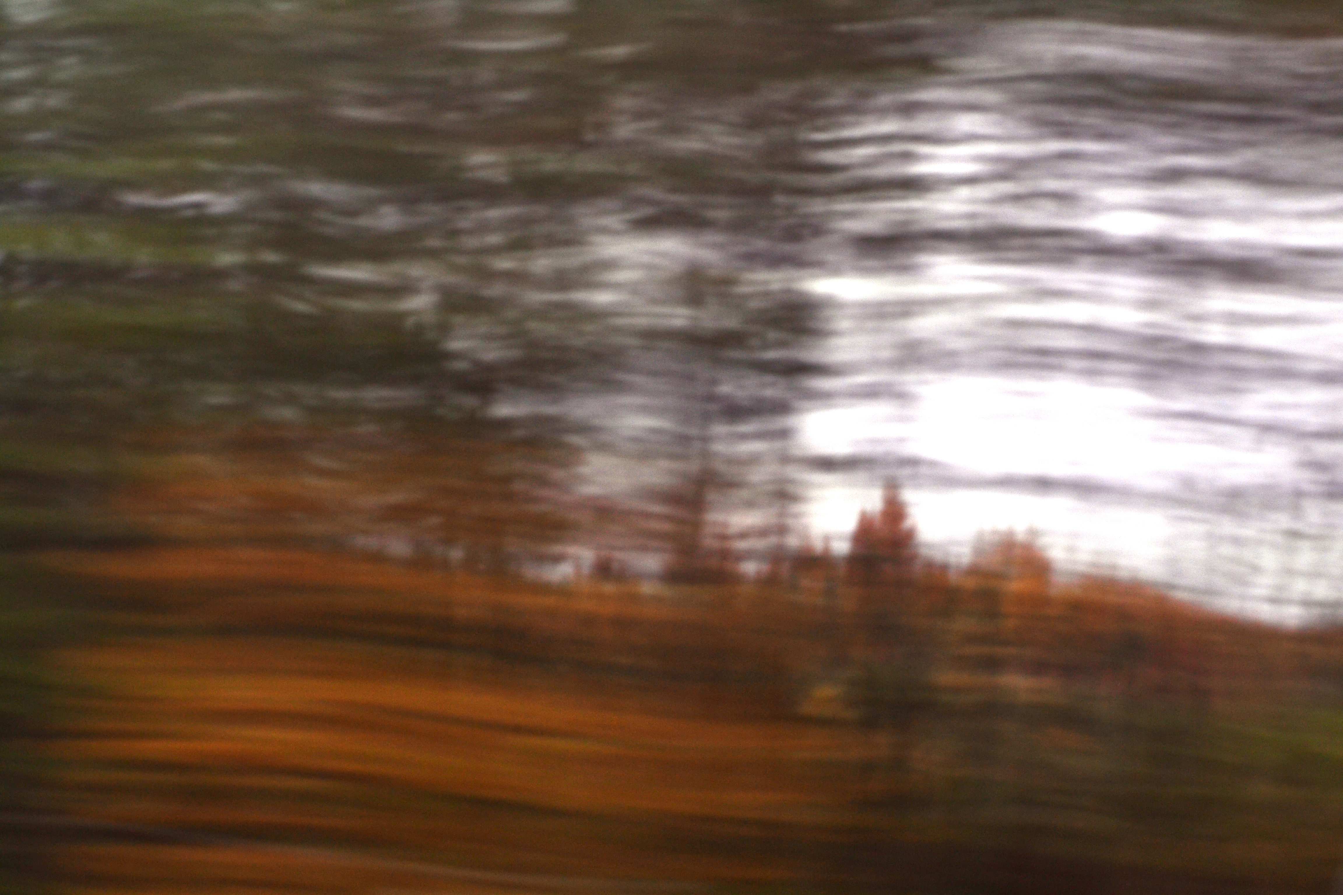 Un mot sur ma photo vedette, de la série floue, ma nouvelle marotte : j’étais assise sur la banquette arrière de ma Sonic, ma photo a donc été prise derrière la vitre. Je portais un vêtement blanc dont on n’aperçoit pas le reflet, mais ça ne veut pas dire que j’ai su maîtriser mon filtre polarisant. J’avais peut-être un peu froid, admettons, et je portais peut-être une veste noire sur mon chemisier blanc. La couleur orange brûlé provient des mélèzes, il y en avait beaucoup le long de la route. Et la couleur grise, qui pourrait être interprétée comme étant celle d’un plan d’eau derrière les arbres est celle du ciel. J’ai cessé d’avoir froid, sur la banquette arrière, quand Denauzier est venu s’asseoir à côté de moi et que je me suis laissée porter par les inflexions de sa voix chaude.