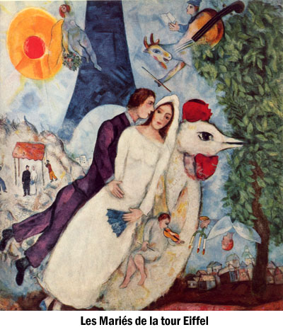 Je me suis absentée assez longuement, treize jours, de la maison de Montréal pendant la période des fêtes. J’étais bien entendu chez Denauzier. À mon retour, hier lundi après le travail, un petit mot d’Emma m’attendait sur la table, qui me disait d’une part qu’elle allait rentrer tard le même soir, ensuite qu’elle comptait se lancer dans la lecture de Principia Mathematica de Newton, pas forcément hier soir, et enfin que je lui avais beaucoup manqué. Beaucoup d’informations en peu de lignes ! M’attendaient aussi deux cartes de souhaits, une carte européenne de mon amie qui vit maintenant au Portugal, et une carte ontarienne de ma seule et unique Thrissa. Dans l’ontarienne, mon amie m’a écrit, à travers les souhaits, qu’elle ne m’oubliera jamais. Cela m’a fait chaud au cœur. Je me suis rappelé qu’il y a maintenant longtemps, plus de vingt ans, Jacques-Yvan, dans notre première année de relation, m’avait donné une carte représentant Les mariés de la Tour Eiffel de Marc Chagall, dans laquelle il avait écrit, idem, qu’il ne m’oublirait jamais. Ma copine anglophone est plus ferrée que Jacques-Yvan en conjugaison des verbes car elle n’a pas omis le e du suffixe er pour les verbes du 1er groupe. À l’époque, j’avais été un petit peu déçue que Jacques-Yvan l’ait oublié. En retour de cette carte de Marc Chagall que Jacques-Yvan me donnait, je lui en avais donné une également. Nous avions été séparés pendant quelques semaines et nos retrouvailles venaient, nous avions eu la même idée sans nous en parler, avec chacun une carte de mots tendres. La carte que j’avais donnée à Jacques-Yvan était, elle aussi, la même, celle des Mariés de la Tour Eiffel.
