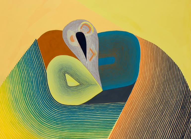 Deux de mes toiles sont installées sur les murs de la maison de Denauzier. J’ai peine à croire que c’est moi qui les ai peintes. Déracinées de leur lieu d’origine (mon appartement de Montréal), elles semblent attendre l’arrivée de frères et de sœurs qui n’existent pas encore, qu’il me reste à créer. Comme je serai immergée dans un environnement pas mal différent, vais-je me mettre à peindre selon un style différent ? Difficile de répondre puisque je n’ai pas même de mots pour décrire mon style jusqu’à maintenant. Naïf et primitif sont les deux premiers mots qui se manifestent à mon esprit. Je regarde des toiles ici et là sur Internet et il me vient l’envie d’essayer de les imiter. Ce pourrait être une manière de m’éloigner de la naïveté et du primitivisme pour me définir autrement. Mais chassez le naturel et il revient au galop. J’aime la toile en photo-vedette, très appliquée, sage, pas du tout éclatée, qui pourrait être mon premier projet d’imitation. J’y vois une cigogne, la tête (en gris rosé) appuyée sur celle de son bébé (en vert), il s’agit d’un bébé qui a une grosse tête. Les deux volatiles sont enveloppés d’un châle aux rayures multiples. Ils se lovent tendrement. Mais j’imagine qu’il en est tout autrement dans l’imaginaire de Jenny puisque la toile s’intitule Vices. C’est à n’y rien comprendre. Cela me fait penser à la manière dont j’ai décrit une de mes toiles, il y a longtemps, en faisant référence à une patate de l’Île-du-Prince-Édouard, jour 1 740. J’ai beau vanter ma plume agile et trouver que j’écris bien, je pense que je n’ai pas ce qu’il faut pour être critique en arts visuels.