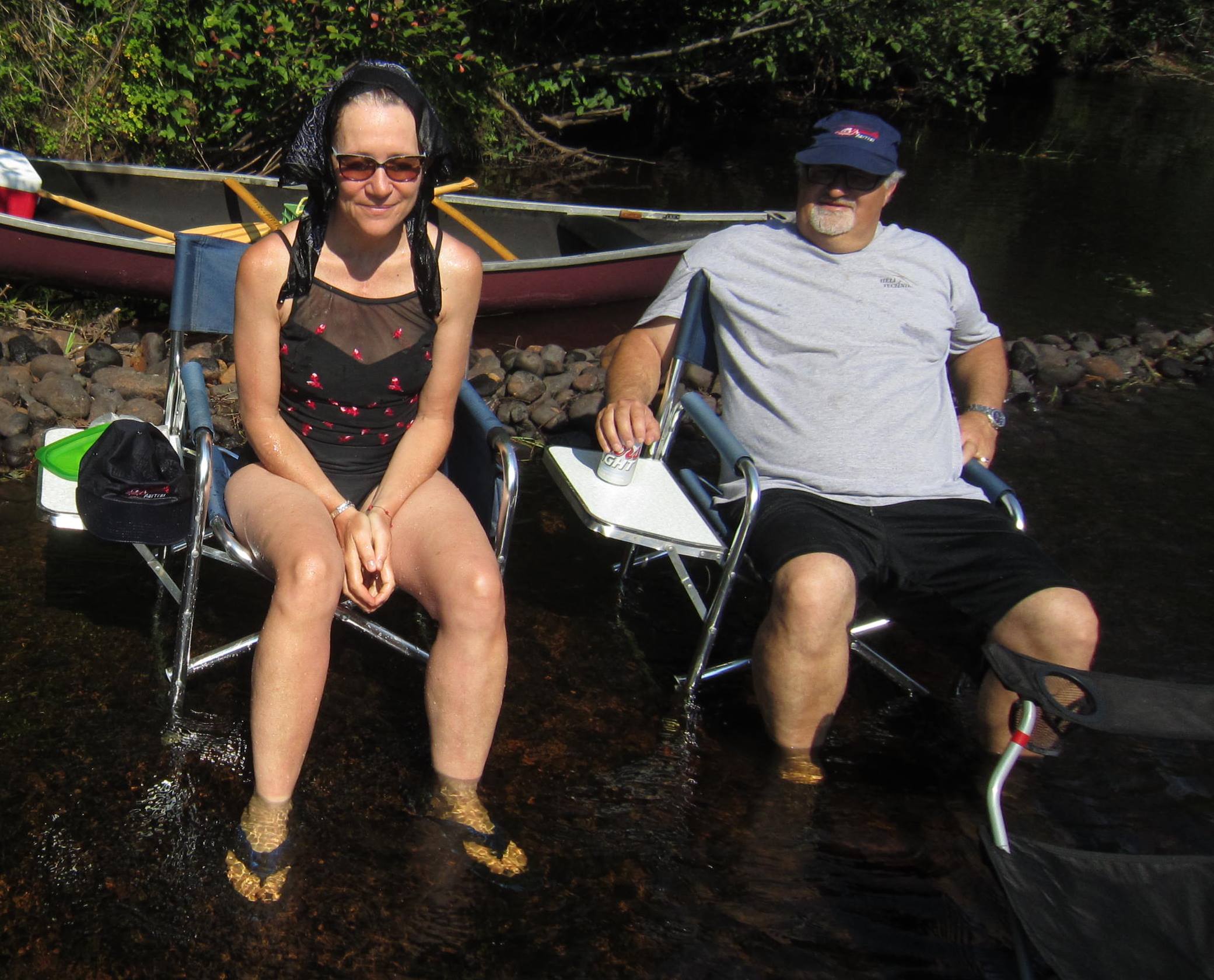 Je ne me permettrais pas de mettre en ligne une photo sur laquelle le sujet apparaît aussi laid, à moins que le sujet ne soit moi, ce qui est le cas. La photo est floue, mais on m’y reconnaît quand même. Elle dégage moins de zest que mes photos précédentes, celles avec haut de bikini couvrant les seins, puis les omoplates. Je porte les sandales de Denauzier pour me protéger des petits cailloux dans le fond de la rivière et on peut distinguer mon vernis gris aux ongles de pieds –que j’ai enlevé depuis. À cause de la réfraction de l’eau, on dirait que je souffre d’œdème aux pieds et aux chevilles. Mon maillot a peut-être vingt ans, je le portais du temps de ma vie avec Jacques-Yvan, quand chouchou était toute petite et que je tirais sa voiturette derrière ma bicyclette sur les routes pas toujours tranquilles de la région de St-Placide. En passant, chouchou a 19 ans aujourd’hui le 23 août. Je porte sur la tête un accessoire qui m’est très cher, à savoir le bandhana. C’est François qui m’a fait découvrir les vertus des mouchoirs de poche blancs en coton, et c’est le hasard qui m’a fait tomber sur un bandhana noir et blanc alors que je fouillais dans un fond de tiroir chez Denauzier. Nous étions au parc Jeanne-Mance, François et moi, assis sur un banc, et je pleurais tellement qu’il m’avait donné son mouchoir en le sortant, je m’en rappelle fort bien, de la poche arrière, bien plié, de son pantalon beige. Voyant à quel point le mouchoir m’était nécessaire, il m’avait dit que je pouvais le garder. Découvrant à quel point il est utile de porter sur soi un mouchoir, blanc ou imprimé, je ne m’en suis plus jamais passé. Sur la photo, le bandhana me dégouline de part et d’autre du crâne car après l’avoir plongé dans l’eau de la rivière, je me le suis appliqué sur la tête pour me rafraîchir. Je prie la bonne Ste-Anne pour qu’elle me protège du coup de froid, tel un coup de fouet, que constituent les dégoulinades. La chaise sur laquelle je suis assise est pourvue d’une tablette sur laquelle est déposée une casquette. Dans une étape deux de mon rafraîchissement, je me suis aussi fait couler de l’eau sur la tête en la prenant de la rivière à même ma casquette, faisant ainsi de la casquette une grosse cuiller, une louche, une braoule, dirait papa. C’est une autre forme de body art, finalement, aux antipodes de l’esthétisme, ou encore un exercice d’humilité, que constitue la publication de cette photo.