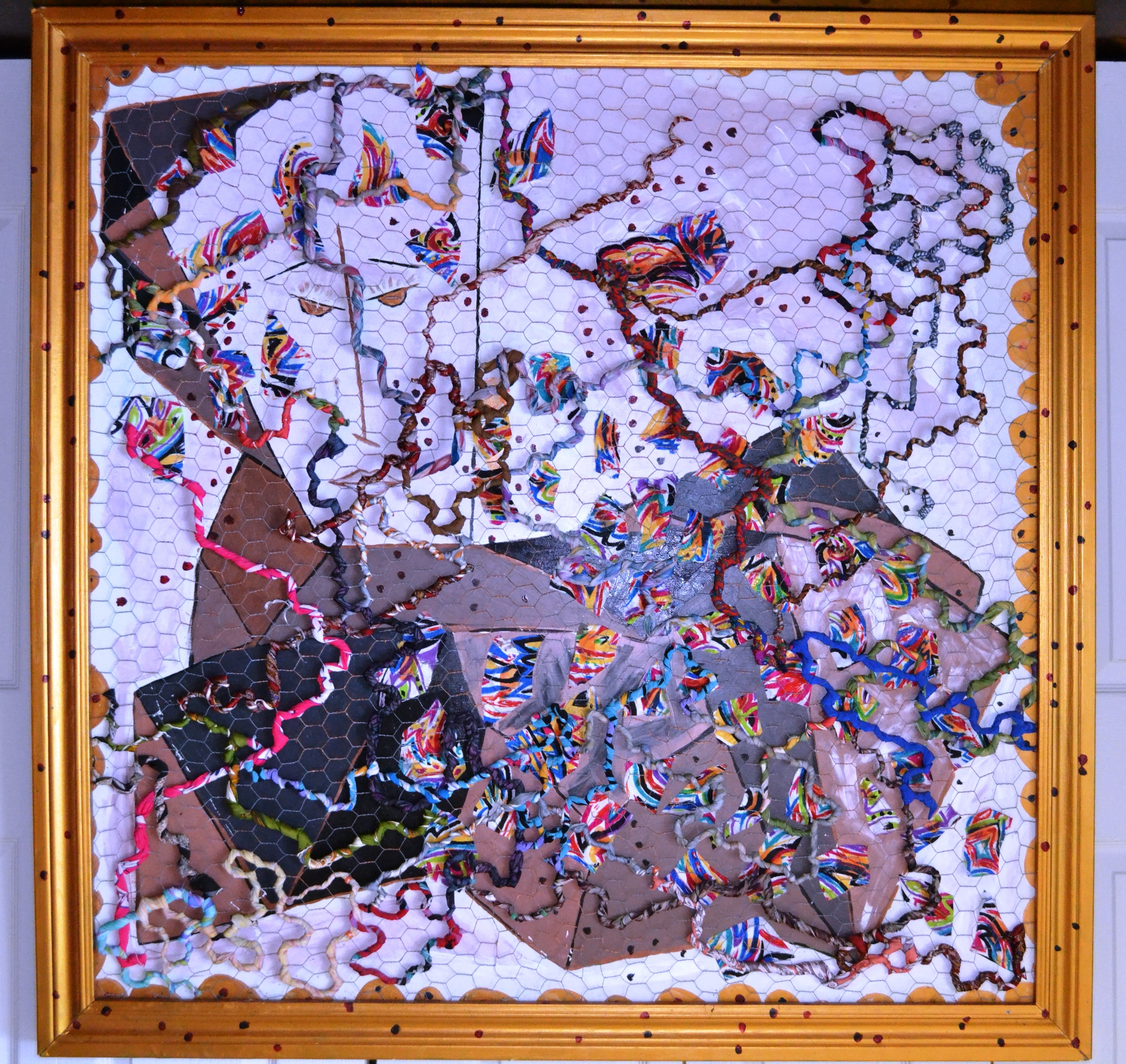 Pour rappel de mémoire, le chien sur cou de girafe a eu une vie antérieure, dans laquelle il était prisonnier d’un grillage de poule, comme on le voit ci-contre. À cette époque, je ne savais pas que mon tableau était porteur d’un si beau chien. Le tableau représentait plutôt un personnage sommairement dessiné, comme en attestent la paire d’yeux, la ligne du nez et la bouche, dans la partie blanchâtre, en haut, à gauche. Le grillage de poule, et les bouts de tissu entortillés sur le grillage, reposent maintenant dans une des poubelles du garage. Ce tableau a longtemps tenu compagnie à Emma, dans sa chambre, sur un mur. Ma fille a beau ne pas être regardante quant à la beauté des œuvres d’art qui parsèment sa vie, elle a quand même fini par me demander de l’enlever pour le mettre ailleurs. Il s’est retrouvé dans mon nouvel atelier, ici à St-Jean-de-Matha, déposé à l’envers, et c’est ainsi qu’un bon matin, regardant cette horreur et me demandant quoi faire avec, j’y ai vu ledit chien sur cou girafien.