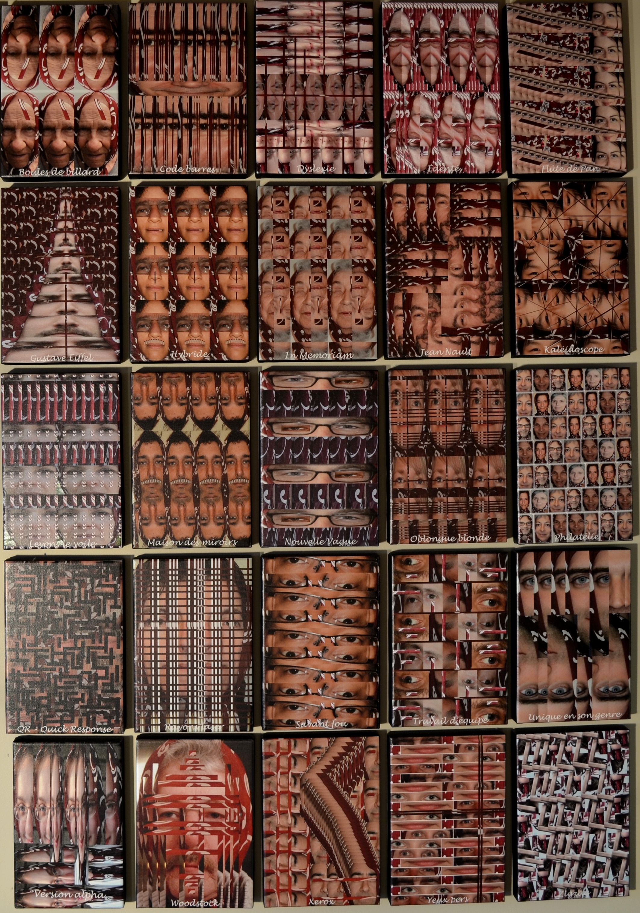 Je me suis alors tournée vers les montages que j’ai faits le soir, au bureau, après les heures de travail, en utilisant le logiciel InDesign, à partir de photos qui ont en commun le port du foulard rouge de feue ma tante Alice. Les montages ont évidemment, à cause de ma maladie, un titre par ordre alphabétique. La mosaïque obtenue et photographiée ci-contre est installée sur le mur qui se trouve à notre gauche lorsqu’on monte l’escalier pour atteindre notre chambre à coucher. Chaque petite toile est collée au mur avec du velcro. Androgyne, qui démarre le bal, se trouve à l’extrême gauche au coin supérieur et n’apparaît pas sur la photo. Elle constitue une sorte de lettrine à laquelle s’attache le reste. Je n’ai pas abandonné ce projet, mais une fois que je l’ai eu terminé, personne n’en a dit du bien, sauf Denauzier et sauf ma belle-sœur qui, d’habitude, n’est pas très versée vers les expérimentations artistiques.