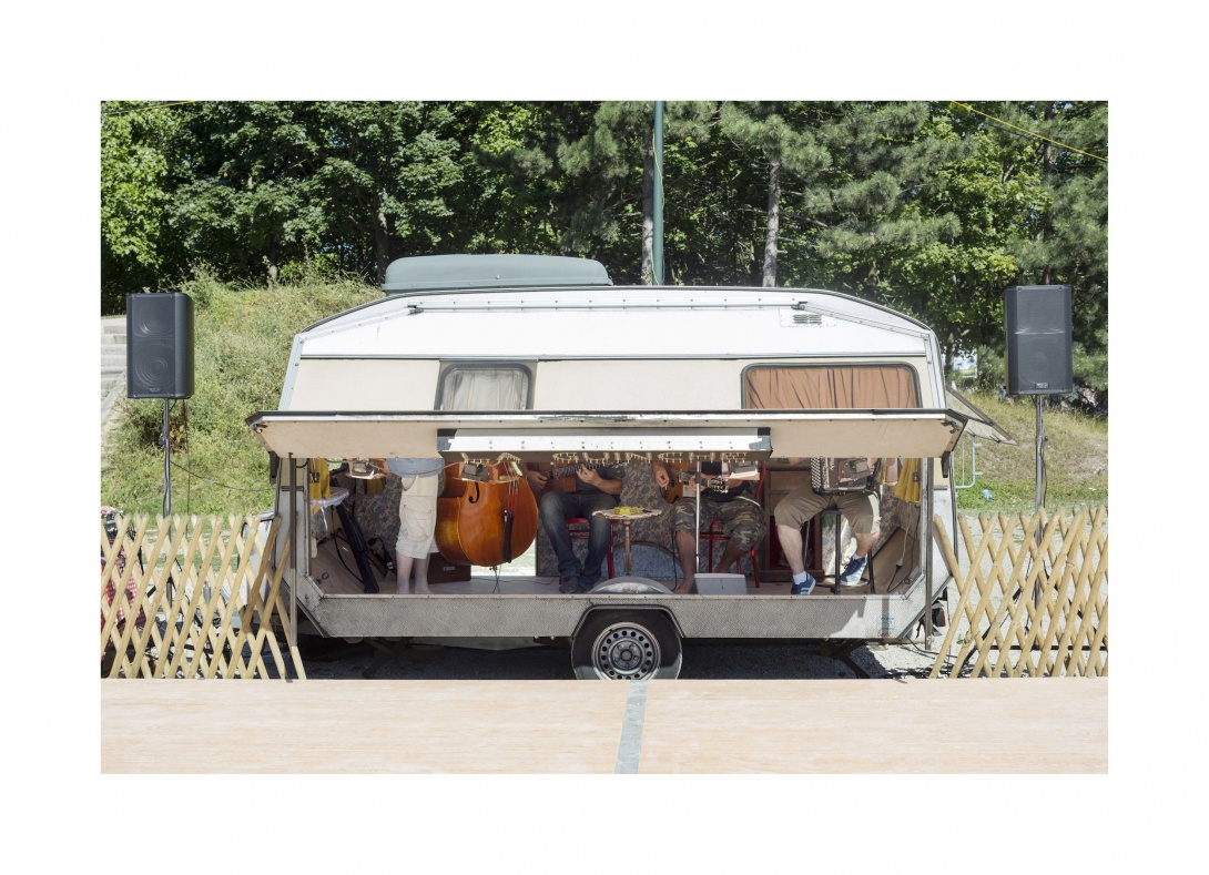 J’adore cette photo prise en plein soleil. Elle va bien avec la température magnifique que nous avons aujourd’hui. Comme à peu près tout ce que je consulte sur le web, à moins que je ne sois à la recherche d’une recette culinaire en particulier, je l’ai découverte par hasard en survolant un article consacré au photographe Martin Kollar qui a été publié sur le site Slate.fr. Au premier regard, mon attention a été attirée par les pieds du musicien qui porte des jeans. Dans mon univers mental, une personne qui appuie ses pieds l’un sur l’autre de cette manière a forcément bon caractère, elle est easy going, sans malice, bonne comme du bon pain, etc. Il est fait mention dans l’article que le photographe Martin Kollar s’est fixé pour projet d’explorer la notion du temporaire. Je me suis fixé pour ma part, et pour ceux qui s’en souviennent, le projet de revisiter les vêtements qui ont jalonné ma vie. On remarquera à quel point je m’attarde peu sur le projet du photographe, happée que je suis par la nécessité de me maintenir cloisonnée dans mes petits projets de rien. L’accordéoniste, à cet égard, porte des chaussures Adidas ! Quand on agrandit la photo, on peut lire, sur le volet incliné de la roulotte, les mots La guinche, qui signifie, je ne le savais pas, bal dansant. C’est bien la preuve –le fait d’avoir appris un mot à l’instant–, qu’il m’est bénéfique de sortir de mes petits projets de rien. Au premier regard encore, la photo m’a fait penser au groupe de musique traditionnelle Le vent du nord que j’ai entendu il y a quelques années au festival Mémoire et racines qui se tient à Joliette. Les quatre musiciens de la photo m’apparaissent bien sages en comparaison des musiciens du Vent du nord qui ne seraient jamais capables, pour l’avoir vu de mes yeux vu, de se tenir à l’étroit dans une maison roulotte, tellement ça déménage quand ils jouent de leurs instruments. Je dirais que le musicien qui déménage le moins, dans le groupe, est celui-là même qui attendait au CLSC et qui était assis à côté de moi lors de ma dernière prise de sang en octobre dernier. Fiou ! Je me relis et je me demande comment les lecteurs vont pouvoir me suivre sans avoir le tournis. Ça va dans tous les sens : de la photo prise en France à mon blogue maintenant Mathalois, de la France à nouveau avec le porteur guinchois de chaussures Adidas aux connaissances limitées que contient mon cerveau, vers le festival joliettain ensuite –qui avait lieu au Club de golf !– à la salle d’attente bondée ce matin-là du CLSC…