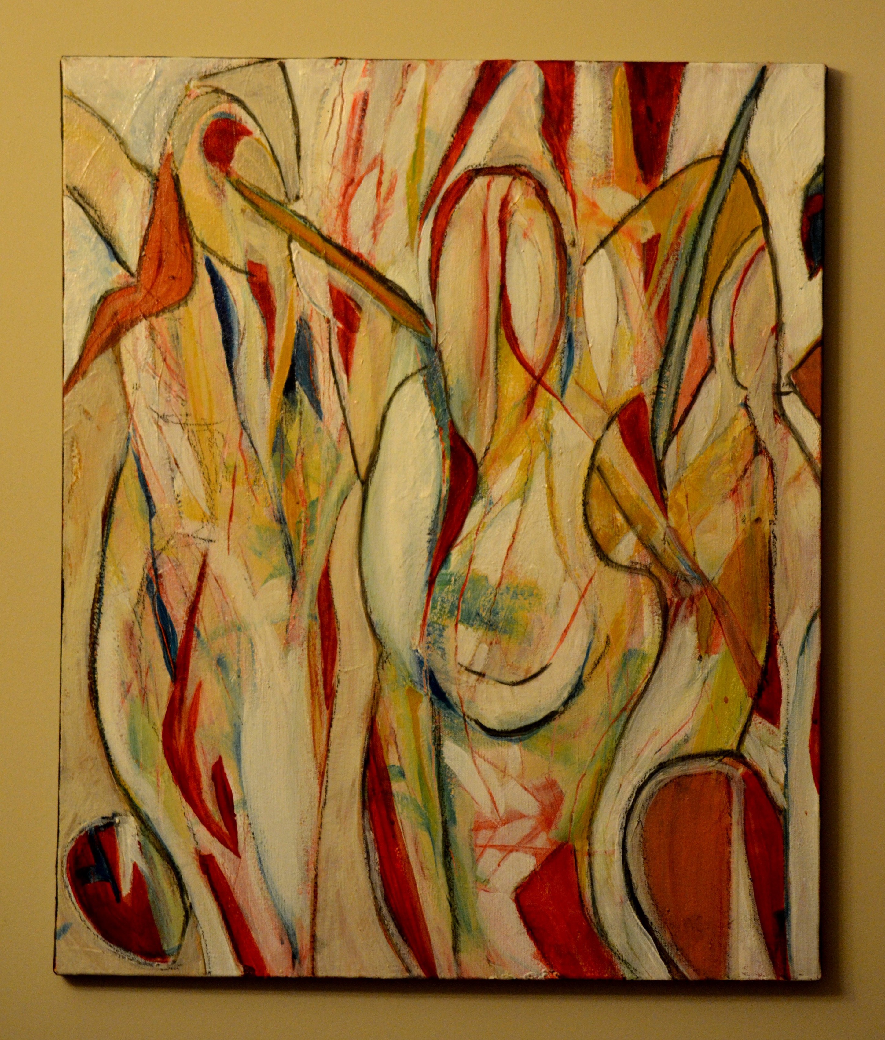 La toile, dépourvue de son cadre, que nous avons achetée à Victoria. J’y vois trois personnages féminins, trois musiciennes, flûte, harpe celtique et peut-être guitare ou mandoline.