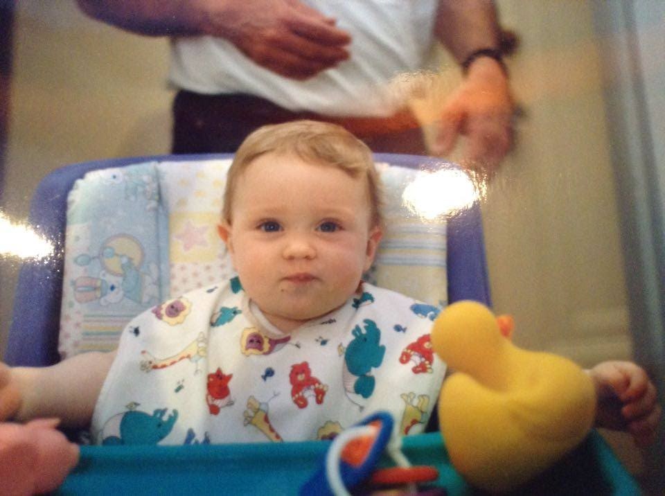 Alors qu’Adela est très petite et ne pèse pas encore 6 lb, Emma faisait 7 lb et 3 oz à la naissance. Elle est née brunette mais vers le troisième mois elle a perdu tous ses cheveux et ils ont repoussé blonds. C’est à peine si j’osais les laver et encore moins les brosser , les voyant tomber. Je me rends compte qu’il y a tellement de choses que je ne savais pas ! Et tellement d’équipement dont je ne connaissais même pas l’existence. Les moniteurs pour l’observer et l’entendre à distance, par exemple. Je n’ai jamais utilisé ça. On la voit ci-dessus photographiée sur une chaise haute que nous avons récupérée dehors sur le bord de la route dans les environs d’Oka. À part un gros sac de poubelle vert rempli de linge qui nous été donné par la sœur de Jacques-Yvan, et la table à langer qui nous a été donnée par mon frère, je me suis débrouillée comme j’ai pu pour subvenir à ses besoins. Je n’ai pas beaucoup de photos d’elle, entre zéro et cinq ans. Je n’avais pas le temps d’y penser, d’en prendre, de les faire développer.