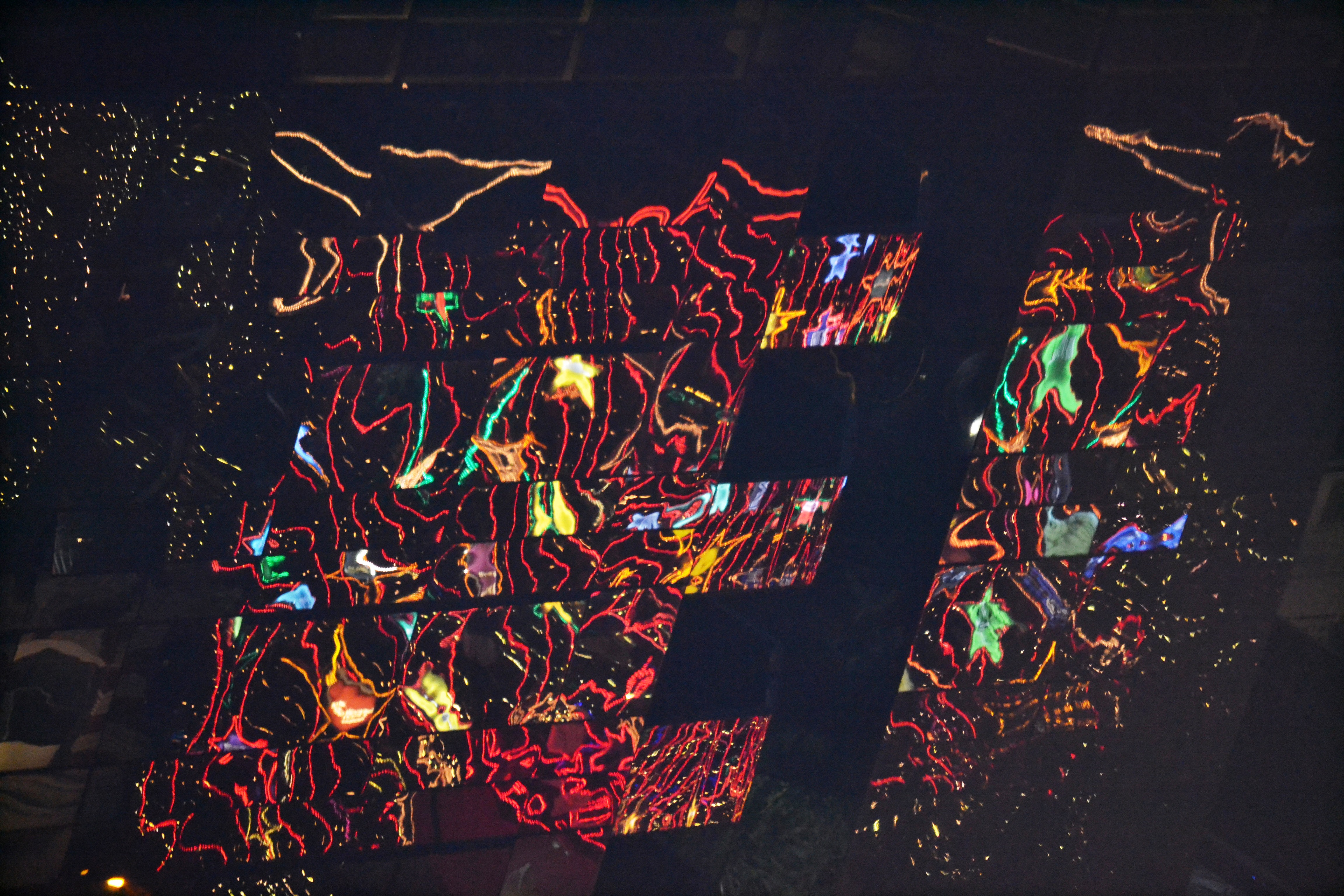 Burrard Blvd., Vancouver, les décorations de Noël de l’hôpital St-Paul se reflètent dans le mur à miroirs de l’édifice en face.
