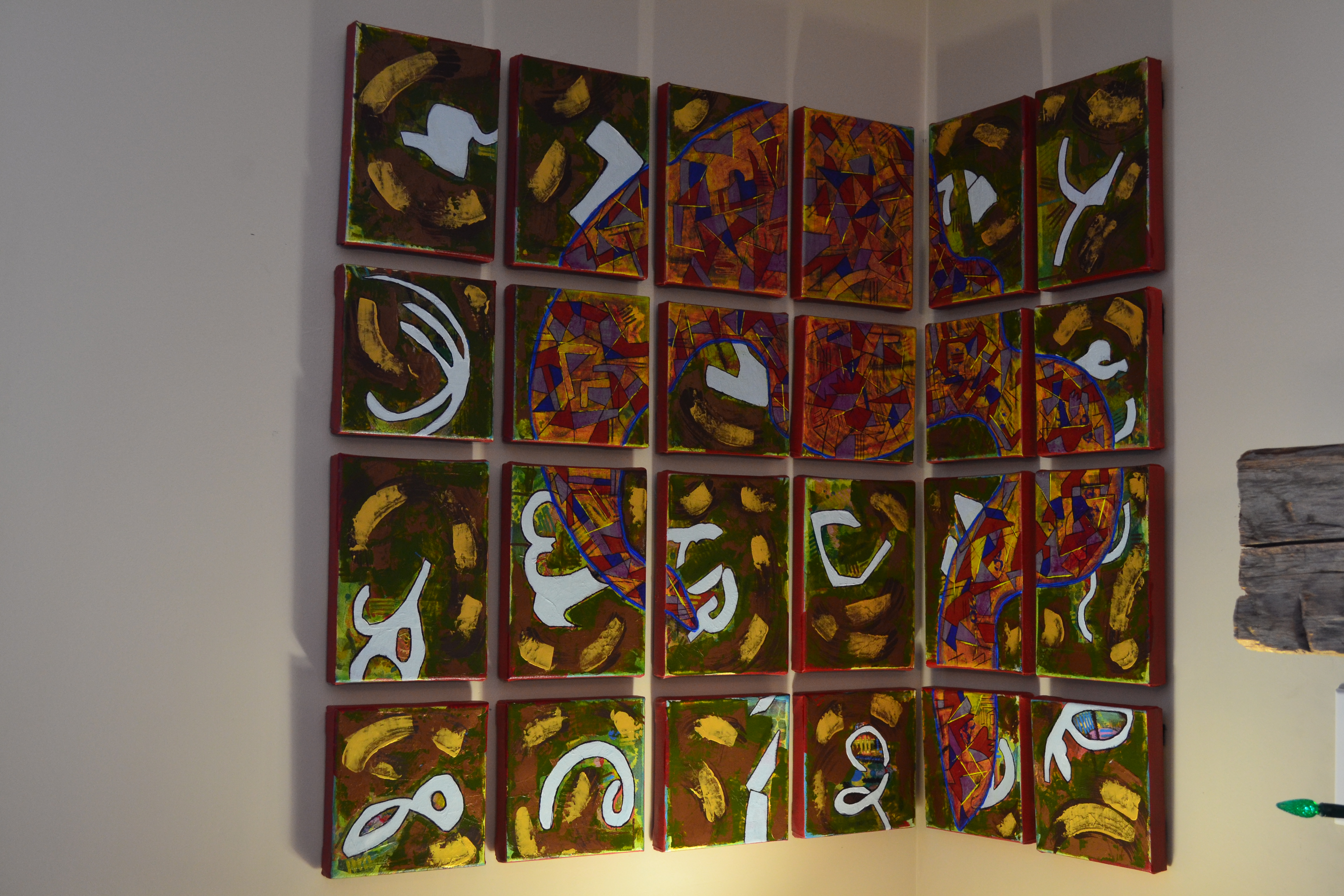 Je trouvais depuis le premier jour de leur installation que ces toiles ne me parlaient pas. Elles ne faisaient que mettre de la couleur sur les deux murs blancs. Il me semble que le thème central des 24 toiles est la masse rouge et bleue en forme de nuage directement sorti de la lampe d’Aladdin. Une fois que cette forme a été complétée, elle a pris le dessus sur le reste qui était déjà en place. Les surfaces dans les tons de vert sont devenues accessoires, elles sont venues accompagner, ou envelopper, la volute de la lampe d’Aladdin. Dans la version A, on ne percevait pas qu’un motif était au service de l’autre. Les deux se rencontraient et il ne ressortait rien de leur rencontre. Dans la version B, la surenchère des messages, des bariolages, des lignages a cédé la place à des masses plus calmes sur lesquelles s’expriment en respirant davantage la volute d’une part, et les lettres de l’alphabet d’autre part, en ce sens que les signes graphiques blancs sont les 24 symboles de l’alphabet badouzien. Je me demande encore, et je ne trouve pas la réponse, et probablement que pour trouver la réponse il faudrait que je tente un essai, je me demande si les symboles de mon alphabet ne devraient pas ressortir de la masse aladdine également, plutôt que d’être ensevelis derrière. À suivre, comme tout le reste.
