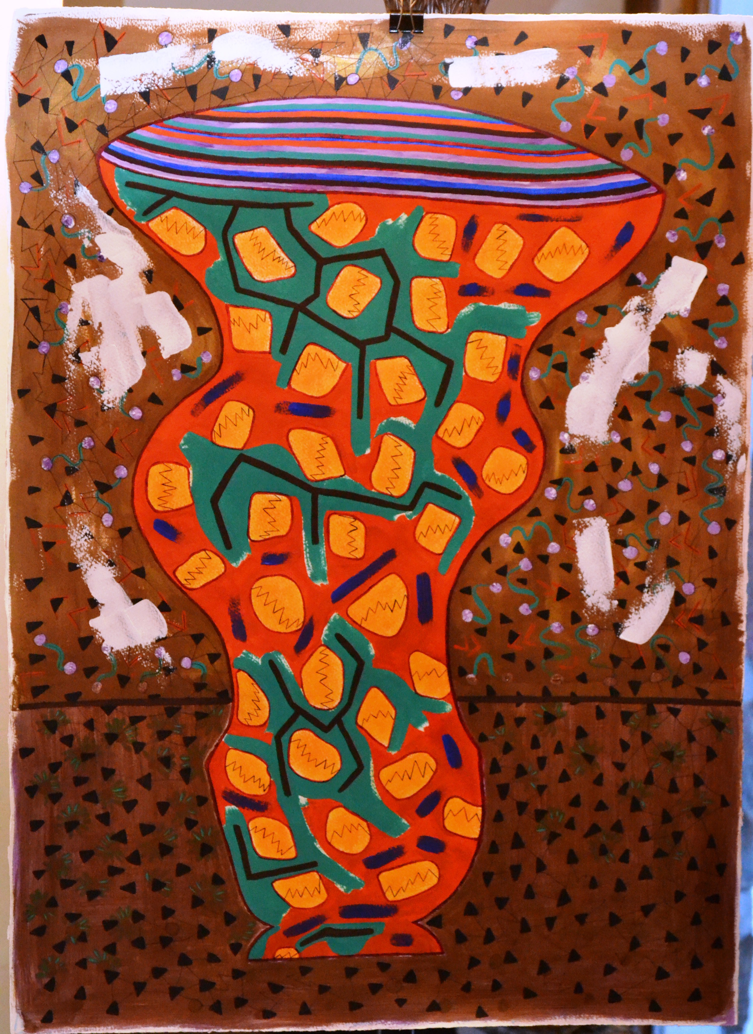 Voici où j’en suis de mon vase. Je réfléchis en ce moment à ce que je souhaite faire. Est-ce que je souhaite dessiner une paire de lunettes sur la table, c’est-à-dire dans la portion inférieure à la ligne d’horizon ? C’était mon idée initiale, mais elle me tente moins qu’il y a quelques jours. Je vais avoir de la difficulté à dessiner la monture, à respecter les proportions, sans parler des reflets dans les verres que je vais être incapable de reproduire. J’opte donc, non par choix mais pour contourner mes incapacités, pour une approche abstraite selon laquelle je vais parsemer de points orangé la ligne d’horizon, à gauche et à droite du vase. À partir de cette ligne de points, je vais créer une masse –de points– qui va se lire à la verticale, comme faisant partie du papier peint, et par opposition je vais garnir la nappe d’un motif de boucles bleues en surimpression sur le fond actuel aux triangles noirs.