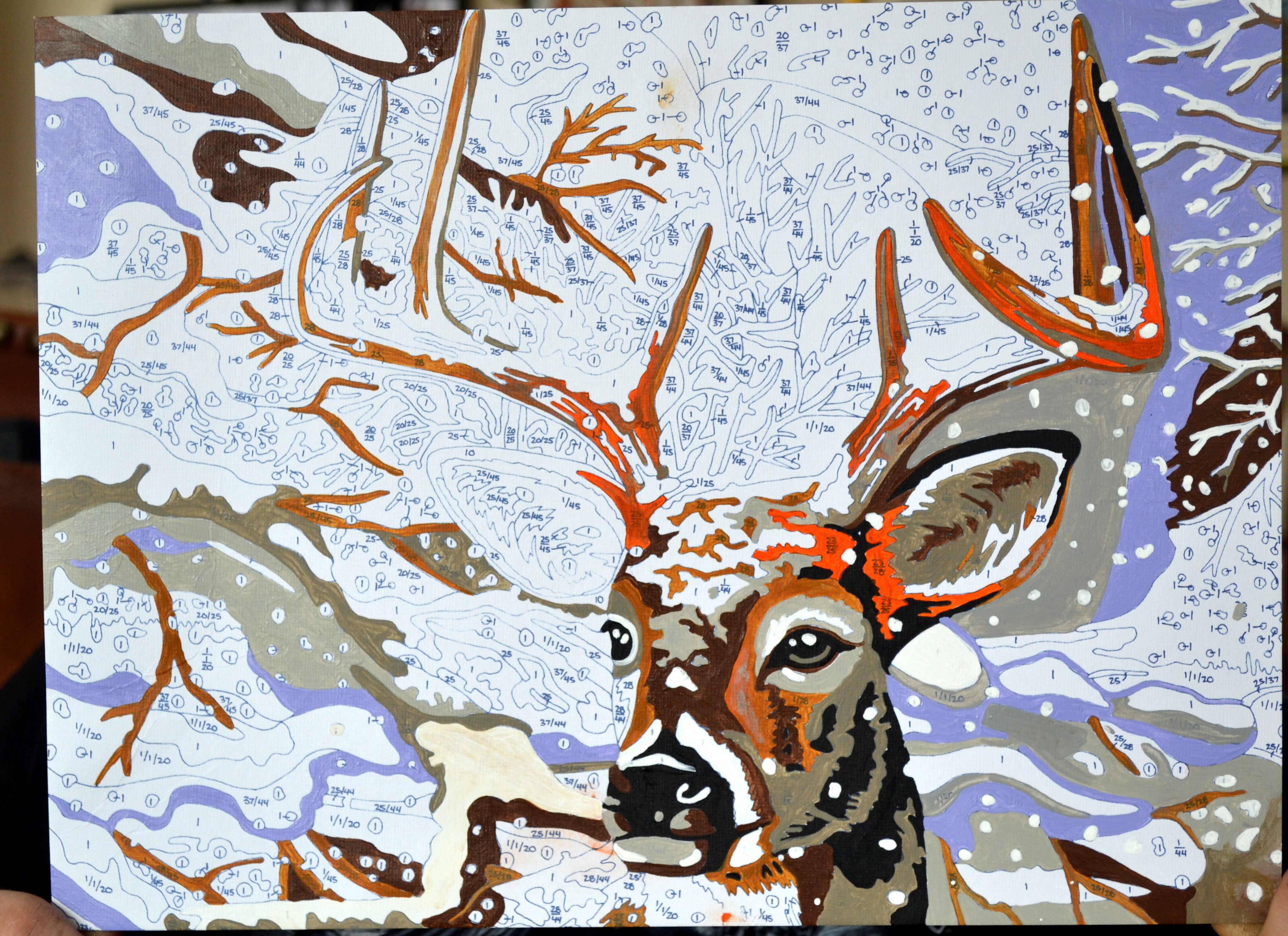 Pour m’occuper hier pendant que je toussais et que le nez coulait, j’ai avancé mon projet de peinture à numéro. Je n’y avais pas touché depuis le 23 février dernier, lorsque nous sommes allées Bibi et moi passer une journée d’arts plastiques chez notre amie à Laval. Il faut avoir beaucoup de patience pour la peinture à numéro. Ou, autre manière d’aborder la chose, il ne faut pas avoir envie de finir vite. Or, j’avais envie de finir vite pour offrir le chevreuil à mon neveu qui se cherche des œuvres pour un encan silencieux et l’encan a lieu ce samedi. J’abordais le projet en voulant qu’il soit le plus rapidement possible derrière moi, sans me préoccuper trop trop du résultat, ou, plus exactement, sans me préoccuper d’avoir ou non du plaisir en peignant. Je me suis appliquée, cela dit, j’ai vraiment fait de mon mieux. C’est très minutieux, c’est dur pour les yeux, et c’est sans surprise aucune car tout est décidé d’avance. Néanmoins je suis contente –et je le serai encore plus quand j’aurai fini– de m’être lancée là-dedans pour l’expérience de l’avoir fait une fois dans ma vie. Je ne comprends toujours pas que le jeu soit destiné à des enfants de huit ans et plus.