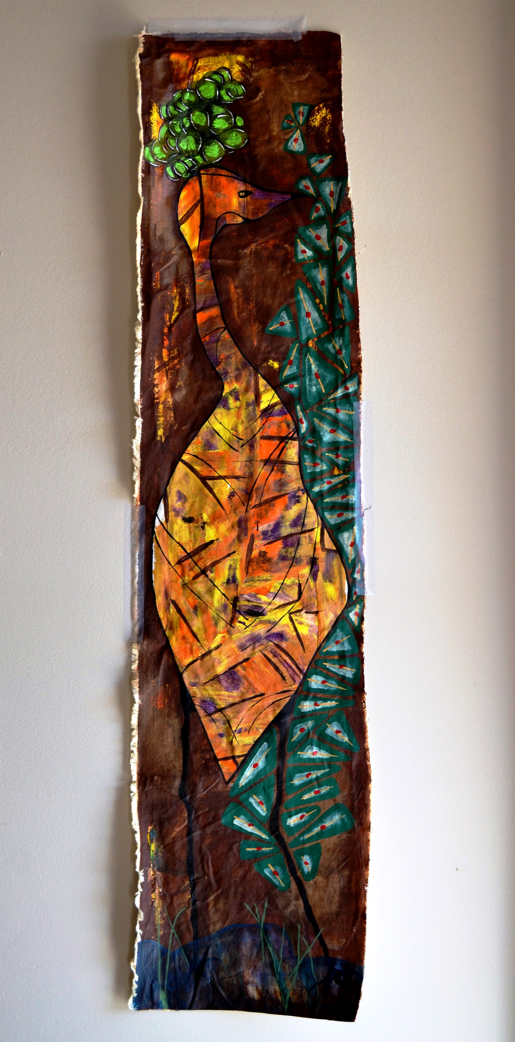 Enfin, je dois ajouter que j’ai trouvé un imprimé de fraises qui provient d’une serviette de table en papier que j’ai miraculeusement trouvée chez Bibi. Ces fraises vont constituer la houppe de plumes décorant la tête de mon deuxième échassier, là où le premier échassier est doté d’une grappe de raisins qui provient elle aussi d’une serviette en papier.