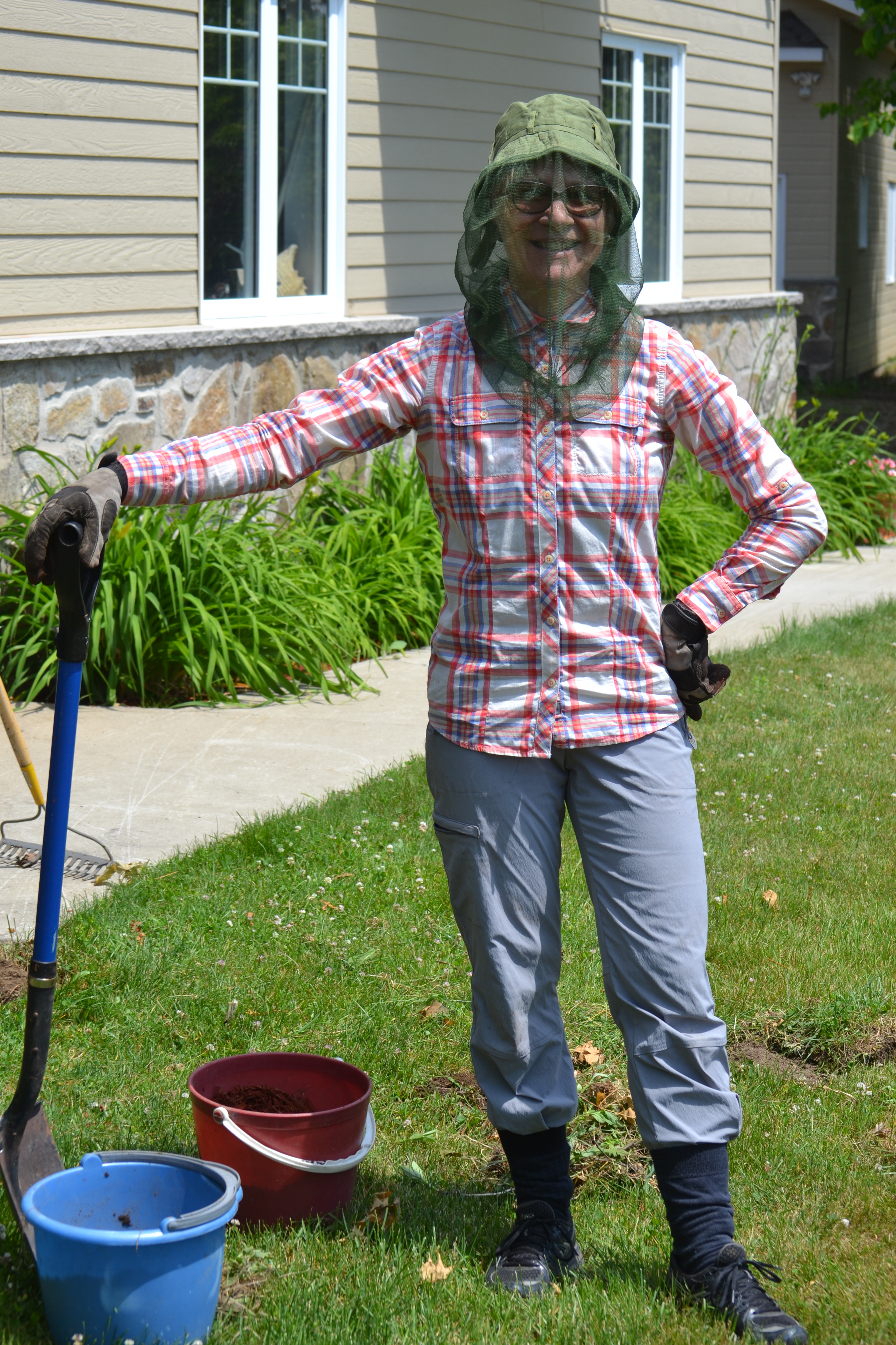 Mince ! La belle plate-bande dans laquelle j’ai planté les quatre poinsettias –qui se portent bien– a mal vécu l’orage violent qui s’est abattu sur la région hier soir. Nous étions à Lavaltrie, chez la fille de Denauzier, où nous n’avons pas eu connaissance qu’il se soit produit un gros orage. C’est ce matin, en sortant de la maison pour mon inspection matinale de la propriété, que j’ai découvert avec consternation une grosse rigole qui traverse la plate-bande de bord en bord. C’est bien la preuve que le jardinage est un art éphémère. Je ne pourrai pas retirer la grosse cicatrice demain jeudi car je serai en aller/retour à Montréal pour accompagner tonton et tantine à l’hôpital. Je n’ai pas pu m’en occuper non plus aujourd’hui car Denauzier m’a trainée ici et là pour différentes courses à faire le matin, et en après-midi je suis allée visiter mon amie du lac Loyer. Je vais donc m’y attaquer vendredi, et porter pour ce faire, probablement, la tenue que l’on aperçoit ci-contre et que j’aime beaucoup. Je ne peux pas m’empêcher de la décrire, même si certains lecteurs m’ont fait part de leur agacement quand je me mets à décrire comment je suis habillée. Je commence par le bas : je porte mes basquettes Asics qui accusent un vieillissement prématuré compte tenu que je les porte en toutes circonstances. Des chaussettes qui appartiennent à mon mari et qui ne sont pas identiques, dans lesquelles j’ai pris soin de glisser le bas de mes jambes de pantalon. Les pantalons ont été achetés l’été dernier quand j’habitais encore à Montréal mais que j’étais à la veille de prendre ma retraite et de m’installer à la campagne. J’avais visité le magasin Sport Expert de la rue Ste-Catherine ouest pour m’équiper de vêtements plus adaptés que mes jupes et mes robes à ma nouvelle vie. J’ai bien fait de les acheter, je ne porte rien d’autre, à tel point que j’envisage d’aller porter plusieurs de mes tenues de travail au comptoir vestimentaire du village. Au moment où j’écris ces lignes, mes pantalons sont encore mouillés d’avoir reçu l’orage d’hier, car ils ont passé la nuit dehors, et les genoux sont couverts de grosses taches terracotta, la couleur du paillis que j’ai étendu autour des hostas que j’ai plantés. Ce qui me plaît le plus, de mon atricure, c’est ma chemise, parce que c’est celle que je portais en juillet l’an dernier lorsque je m’étais prise en photo déguisée en Serge Losique. On remarquera que dans les deux cas, qu’il s’agisse de se déguiser en Serge Losique ou de jardiner en se protégeant le plus possible des bibittes, il faut porter le col attaché au premier bouton. Le chapeau de style bob provient de Denauzier, il était quelque part dans le garage, neuf, ayant encore l’étiquette du prix agrafé à l’intérieur. Je porte enfin les gants de travail de mon mari, qui sont eux aussi très mouillés d’avoir passé la nuit dehors, sur les marches de la galerie. Bien entendu, demain, pour aller à l’hôpital, je vais m’habiller un peu mieux, pour ne pas faire honte à mes aînés.