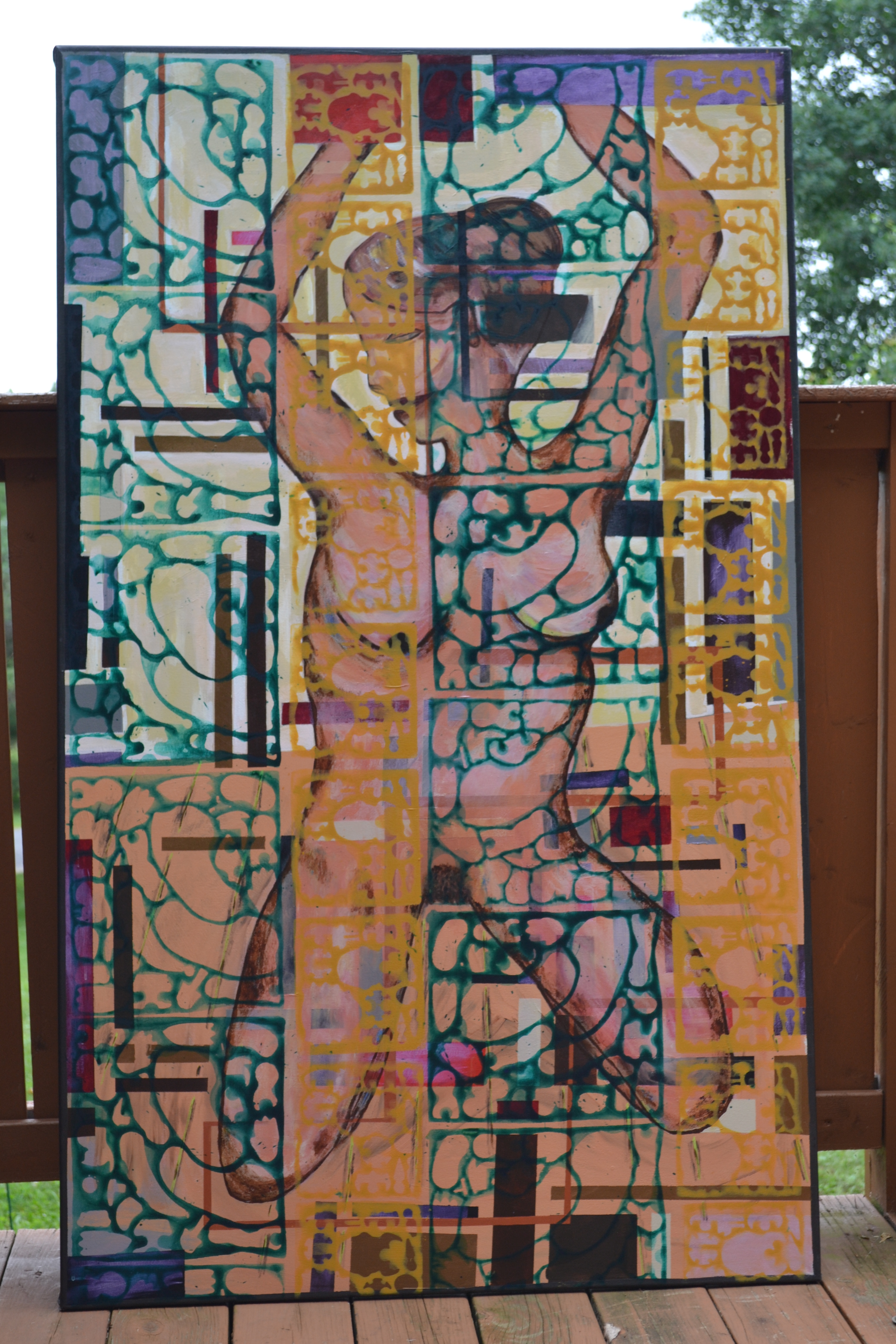 Arts plastiques/activités intérieures : j’ai peint il y a longtemps une femme agenouillée sur un plancher de lattes de bois qui se tient les bras au-dessus de la tête. Il me semble, là aussi, avoir déjà écrit là-dessus. Comme on peut le constater sur la photo ci-contre, la femme fait pas mal pitié, elle a le tronc déformé, elle est maigre à l’os, elle semble avoir reçu une chirurgie au visage au terme de laquelle elle ne possède plus qu’un moignon à la place du nez. Ce sont les lattes qui m’avaient demandé le plus de réflexion et j’avais eu une longue conversation avec mon professeur de l’époque, à savoir si je traçais des lignes pour créer un effet de lattes ou si je laissais la surface pleine et dépourvues de lignes. Le professeur ne m’encourageait pas à tracer les lignes mais j’avais choisi de les tracer. Elles ne sont plus tellement visibles sur la photo, mais ce qui est amusant, c’est que la toile a été déposée, pour la prise de photo, sur la terrasse adjacente à notre maison, terrasse dont le plancher est constitué de larges lattes ! Je ne trouve pas, dans mes répertoires de fichiers, de reproduction de cette toile. Je suis une piètre archiviste. Je me résous donc à publier à la place la même toile, mais avec la surimpression récente, car je l’ai faite hier, des formes répétitives qui apparaissent en vert et en jaune par-dessus la femme.