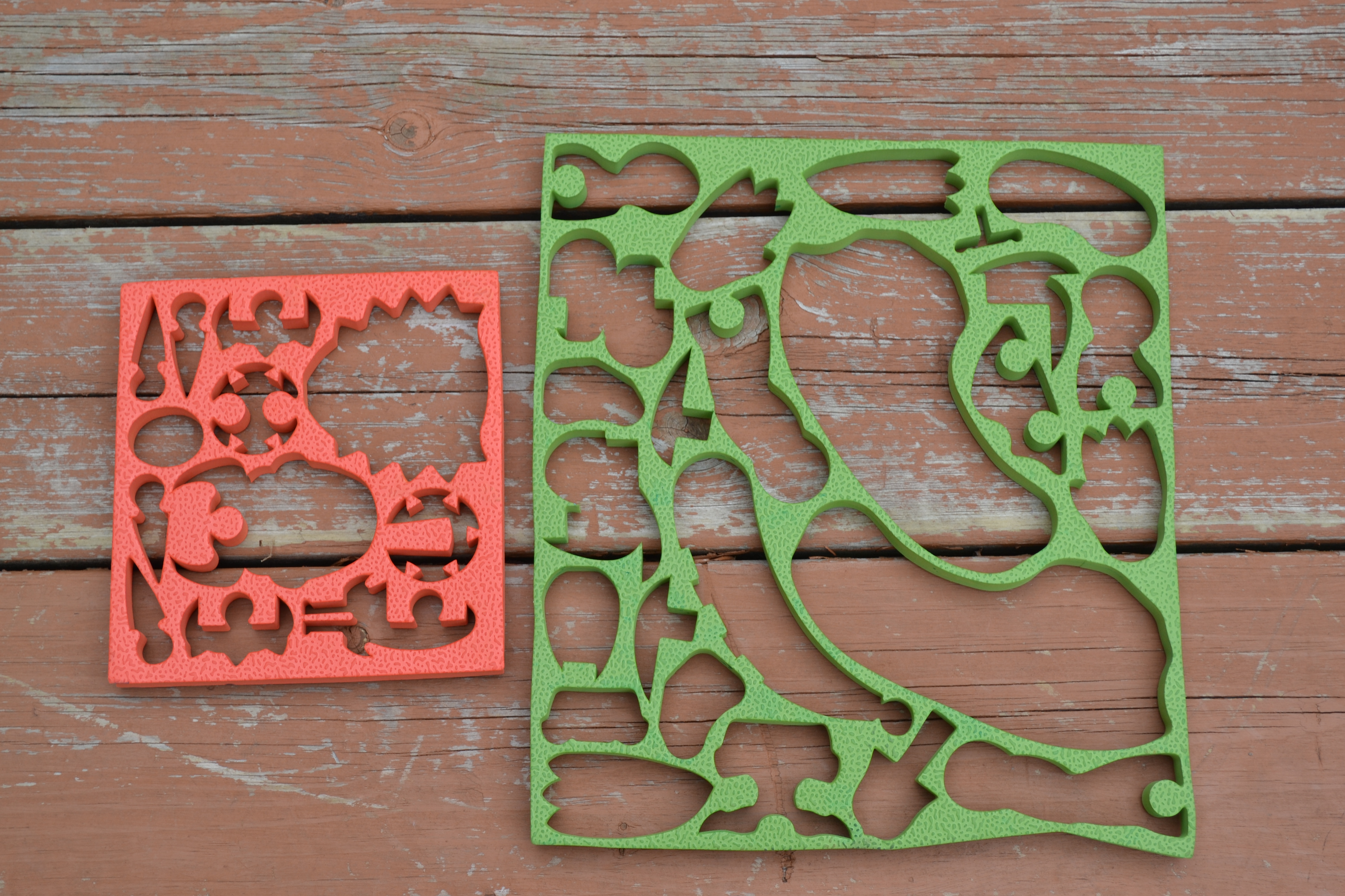 J’ai utilisé, pour créer l’effet répétitif de pseudo-mosaïque, des sortes de moules de styromousse dépourvus de leur contenu. Une collègue me les avait apportés au travail, pensant qu’ils pourraient m’être utiles. Ils proviennent d’un jeu qu’elle avait acheté pour son fils. Une image valant mille mots, voici ci-contre, sur les mêmes larges lattes, les moules en question. Mon projet est le suivant : je vais utiliser ma collection de serviettes de tables pour combler les masses. Je vais donc déposer le moule sur une serviette, tracer le contour d’une forme sur le papier avec un crayon, découper le papier, et le coller avec du polymère sur la toile, par-dessus la femme, pour combler les mêmes masses qui se répètent. Le problème, si on peut dire que c’en est un, c’est que je ne vois pas bien à l’intérieur, même si mon bureau est très fenestré, alors je vais aller faire mes découpages/collages dehors, en m’habillant chaudement. Donc, l’activité véritablement intérieure, ce sera pour une autre fois.