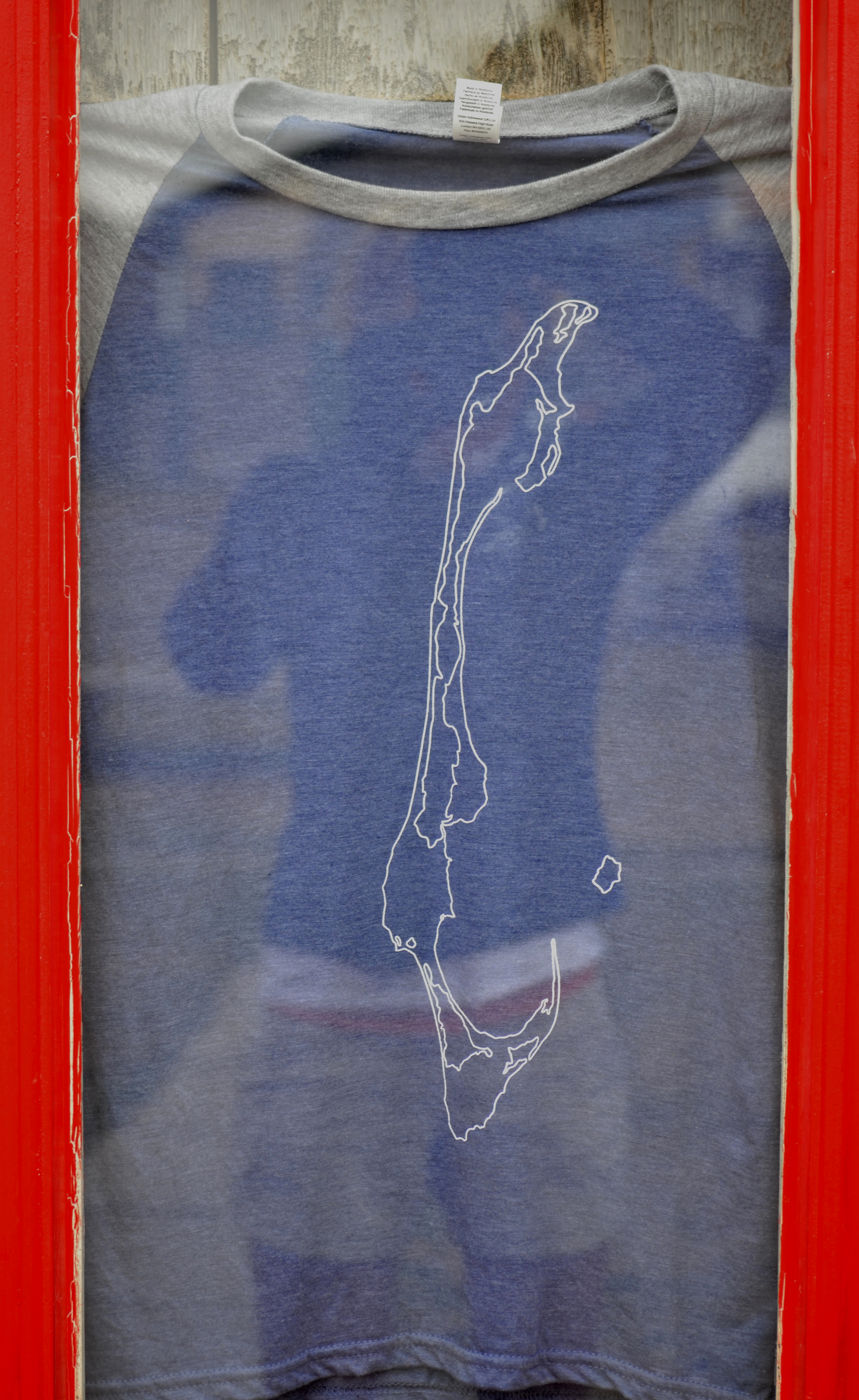 D’après l’étroitesse de la vitre, je dirais qu’il ne s’agit pas de la vitrine d’une boutique mais d’une porte vitrée derrière laquelle est accroché le t-shirt d’une manière quelconque. Je ne saurais dire, de mémoire, de quelle boutique il s’agit. Je ne peux rien garantir non plus par rapport à l’hypothèse de la porte. Pour retracer l’origine exacte du lieu, il faudrait que je retourne aux Îles. Je pourrais me fier à la couleur rouge, capturée par la photo, pour retrouver la porte. Il est possible, bien entendu, que le t-shirt ne soit plus pendu derrière la vitre de la porte…