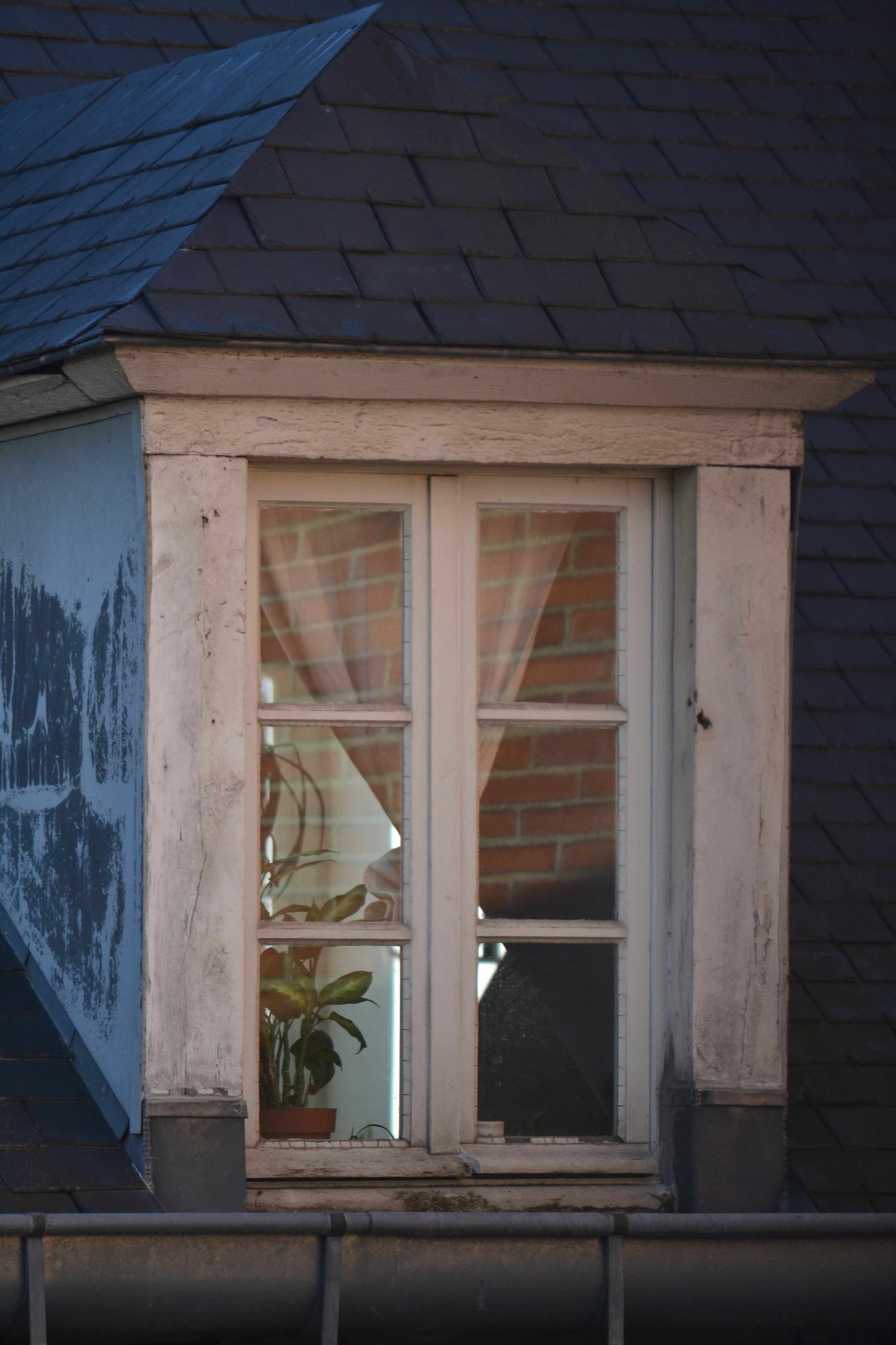 La publication hier de la fenêtre madelinienne donnant sur le visage concentré d’un jeune homme m’a donné envie, pour comparer, de mettre en ligne une autre fenêtre prise depuis l’appartement que nous avions loué à Paris, Clovis et moi, il y a de cela plus de trois ans. Au lieu de me laisser émouvoir par le cachet de l’ensemble, par la poésie du rideau noué et la fragilité de la plante, je vois d’abord à quel point il faudrait protéger du froid les locataires de l’appartement en refaisant le joint de mastic. On a l’impression, quand on observe la portion du bas à droite de la photo, en zoomant, que la vitre tient par la peur. D’ailleurs, dans l’appartement que nous avions loué, il ne faisait pas chaud et le confort était moyen. Nous dormions, par exemple, sur un futon directement déposé sur le sol.