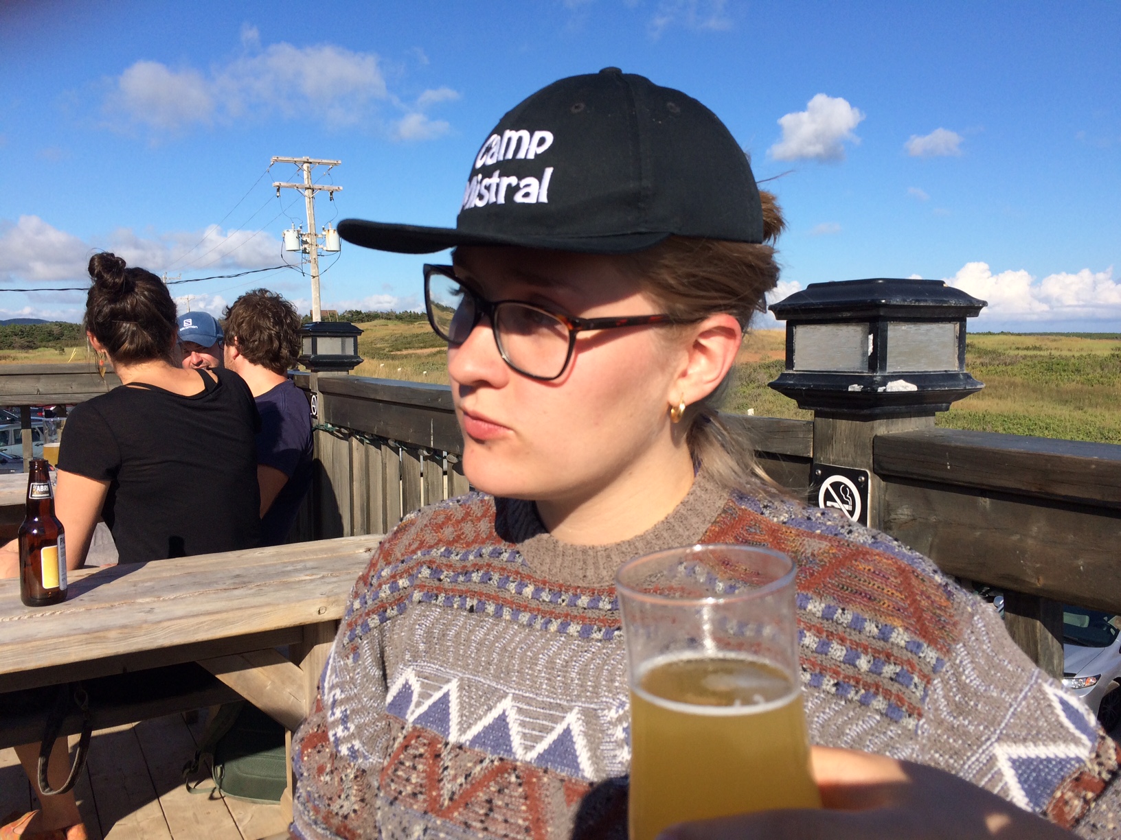 Dix-huit ans plus tard, parce que ma fille a vingt ans, et encore une fois sur une île lors de notre voyage récent, j’ai pris d’Emma une rafale de photos. Nous étions cette fois à la microbrasserie À l’abri de la tempête et nous buvions de la bière, assis sur un banc ! Nous venions de passer l’après-midi sur la plage à ramasser des pierres en prévision de notre atelier de fabrication de bijou qui avait lieu le lendemain. Il fallait arriver avec une pierre de la grosseur, nous avait-on dit, d’une balle de golf. Pas facile. Elles étaient toutes plus grosses, ou plus petites. Pour se protéger les yeux du soleil qu’elle avait de face, au moment de boire la bière, Emma s’est mis une casquette, sans l’ajuster le moindrement, tel père, telle fille. Je l’ai trouvée tellement mignonne avec son Camp Mistral sur la tête que j’ai sorti mon Nikon. J’ai obtenu d’elle plusieurs photos en format paysage.