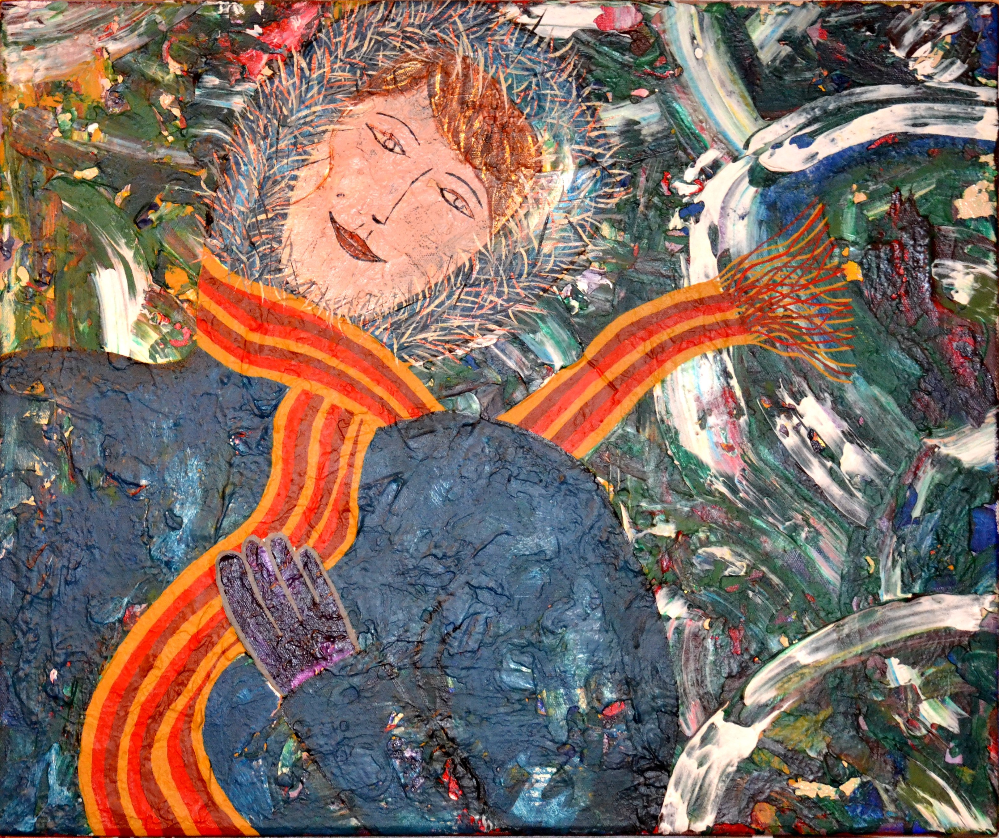 Avant de dessiner le corps au manteau bleu, la toile était entièrement couverte de courbes blanches sur fond vert, comme on le voit encore à droite. La tête s’est imposée la première, je la voyais prendre place dans une courbe qu’avait laissée ma spatule. J’ai utilisé un mélange de blanc crème et de violet pour obtenir la couleur chair du visage, que j’ai adoucie en frottant à l’aide d’un linge humide car la couleur chair obtenue était trop égale, trop épaisse, trop uniforme. Quand j’ai eu fini de couvrir l’espace réservé au visage à l’intérieur du capuchon, je ne voyais qu’un gros visage trop rose de Monsieur patate. J’ai donc frotté encore. Ensuite, c’est le foulard qui s’est imposé. Je ne pensais pas le prolonger derrière l’épaule en reproduisant l’effet d’un foulard qui vole au vent. Mais le désir de croiser les fils à l’extrémité du foulard a été plus fort que moi, alors j’ai prolongé le foulard derrière l’épaule. À la toute fin, je me suis rendu compte que le visage avait besoin d’une frange sur le front, j’en ai donc tracé une, avec un mélange de brun, d’or et de cuivre, et il a fallu ensuite que je repasse sur les poils de loup que je venais de cacher avec les cheveux.