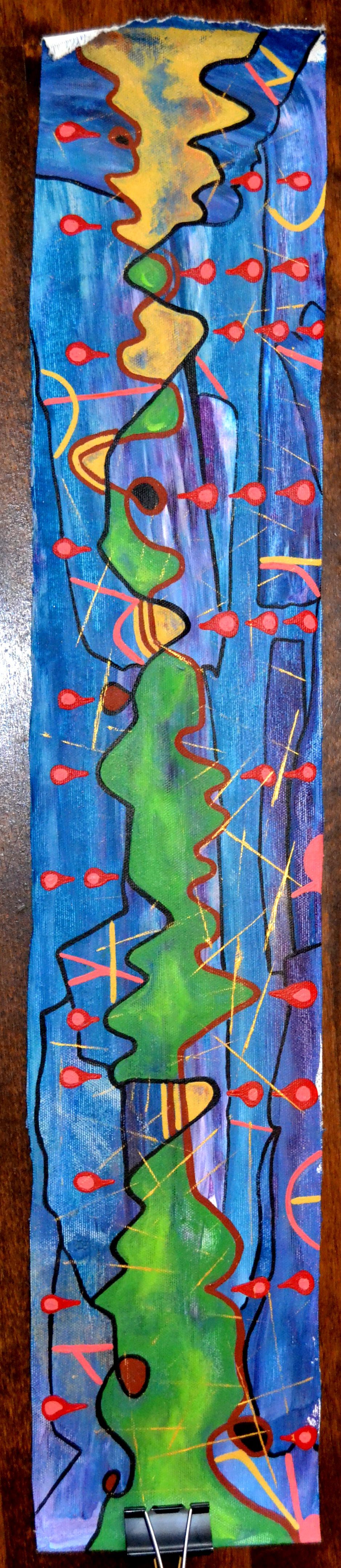 Je ne vais pas couvrir de bleu le bandeau que j’ai parsemé récemment de protubérances qui font penser à des chapeaux mexicains. Je pensais à cette journée récente que j’ai passée à peindre en attendant une idée, une orientation, en surveillant quel allait être le geste spontané –qui n’est jamais venu– qui m’aurait guidée vers un thème à exploiter. Je pensais à ça hier soir dans mon lit alors que je n’étais pas capable de m’endormir. Je ne vais pas le couvrir de bleu et peindre quelque chose d’autre par-dessus. Je vais conserver le bandeau tel quel par tendresse, par égard pour moi et pour mes efforts incessants, qui n’ont rien de valeureux car ne pas me mettre en situation d’efforts incessants, je deviendrais probablement dépressive. Étais-je dépressive, d’ailleurs, cette journée de grand vide qui s’est soldée par des sombrero ? Je consultais une revue d’art récemment et je n’en revenais pas qu’aucune idée cette journée-là ne se soit présentée à mon esprit alors que le monde entier fourmille d’une multitude d’idées !
