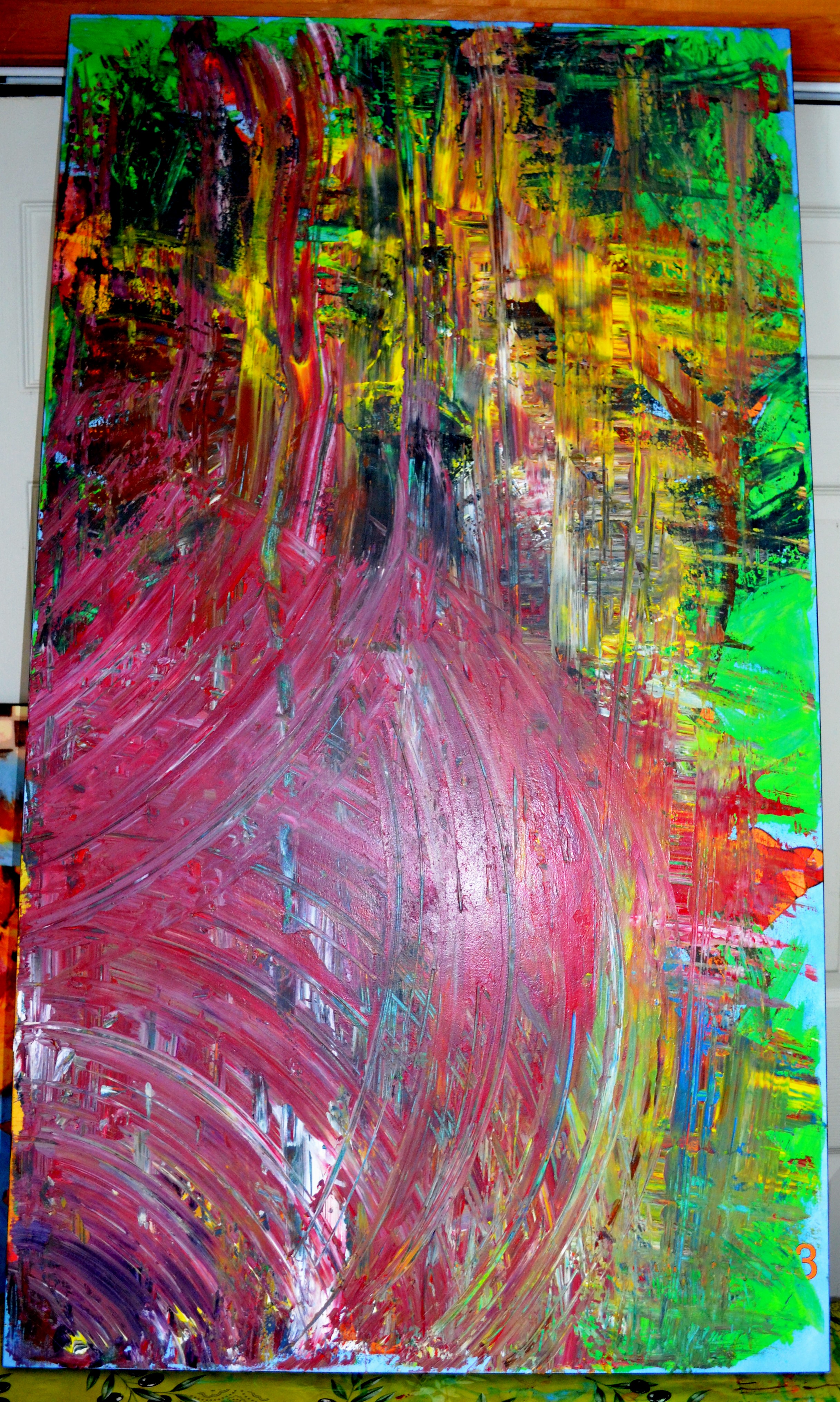 Voici à quoi ressemble ma toile depuis que je l’ai couverte hier de restants de peinture. C’est bien tentant de profiter de la forme bombée du bas, dans les teintes de rouge gris, pour reproduire un oiseau de basse-cour. Ou une énorme citrouille ? Ce serait plus facile la citrouille, je n’aurais pas à me préoccuper du cou et de la tête de l’animal, je n’aurais qu’à surmonter la partie bombée d’une grosse queue un peu inclinée. Mais en même temps, il y a déjà une ligne rouge ascendante qui m’invite à envisager un cou, une tête et une crête de volatile… Demain, mon mari sera absent ainsi que samedi et je vais profiter de cette solitude pour me lancer dans la création d’un possible volatile, sans réfléchir davantage. Si le résultat ne me plaît pas, je n’aurai qu’à peindre à nouveau par-dessus. Point final.