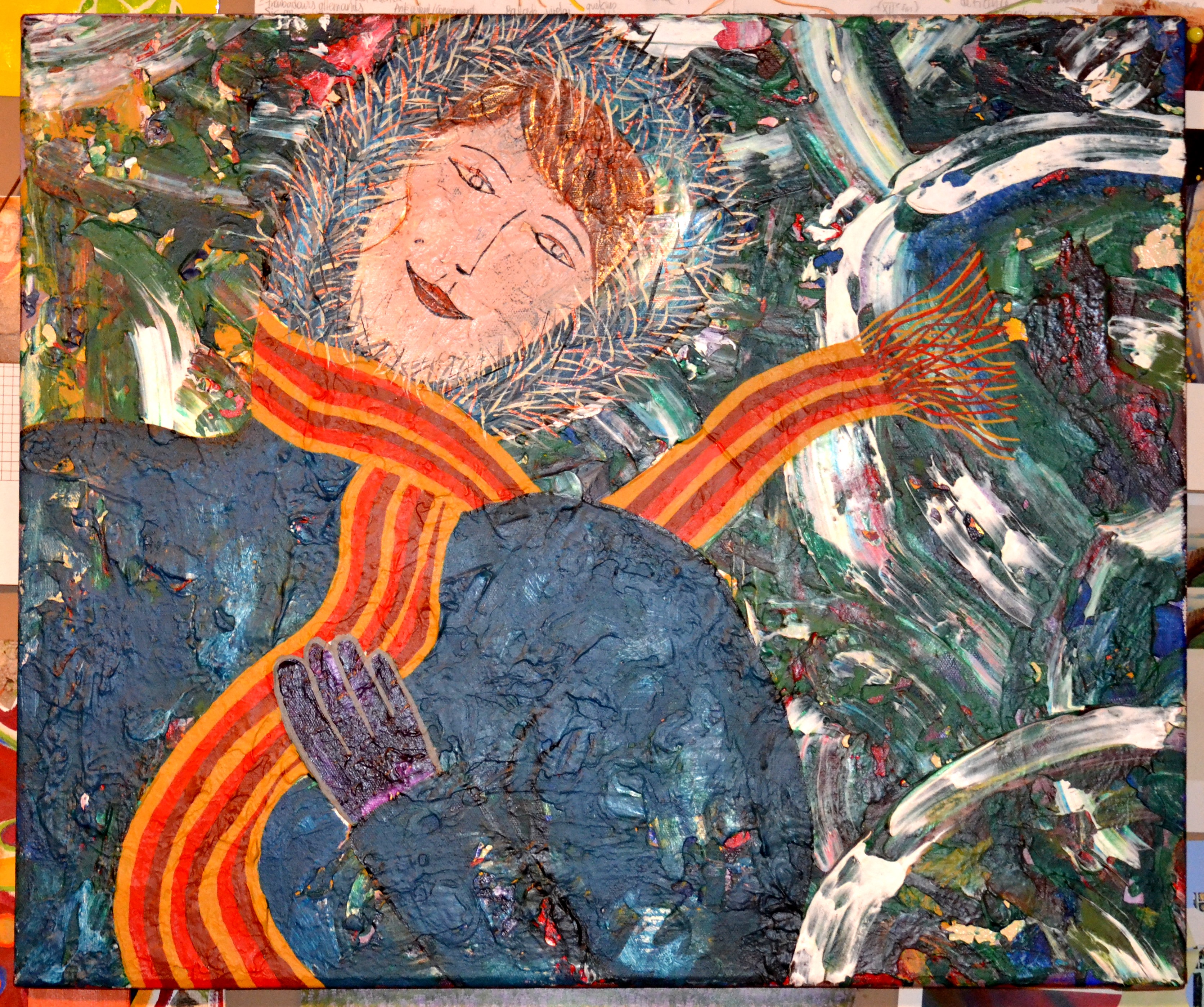 Je dois reconnaître d’ailleurs que ce n’est pas la première fois qu’une personne bien intentionnée me suggère de changer de disque. Quand je me suis lancée dans un chassé-croisé de personnages russes dont les noms et prénoms se terminaient sur le son « ov », Yvanov, Sergiov, Yourmanov…, deux amies m’ont exprimé qu’avec la meilleure volonté du monde, le lecteur n’y comprenait plus rien. Ou encore, quand j’ai présenté mes 26 toiles, à l’occasion de mon premier vernissage, toiles qui avaient un titre commençant par chacune des lettres de l’alphabet, et titres qui se terminaient tous par le son « é », je me rappelle avoir comparé le visage d’un personnage à une pomme de terre de l’Île-du-Prince-Édouard. Ce texte ne comptera probablement pas au nombre de mes plus réussis. Cette toile n’existe plus, cela dit en passant, j’ai peint par-dessus mon autoportrait, en photo-vedette ci-dessus, où j’apparais en parka avec capuchon poilu.