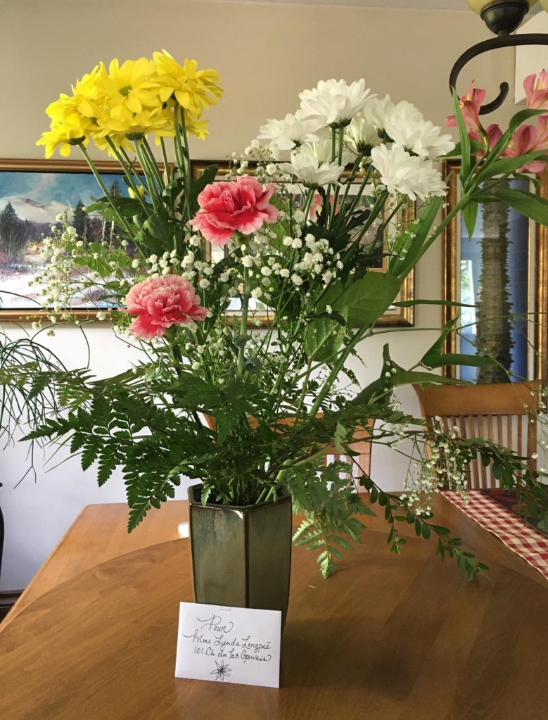 J’en étais là de mon énumération à la Perrette et le pot au lait, lorsqu’on a sonné à la porte. Mon mari est allé répondre, pour venir me tendre un magnifique bouquet de fleurs provenant de ma tendre amie Martina Morinavska.