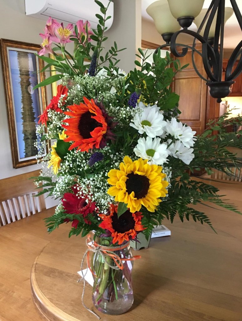 Surprise hier. On sonne à la porte et c’est à nouveau le livreur de fleurs. Elles m’ont été offertes par une personne qui ne sait même pas que j’écris sur un blogue. Or, les fleurs étaient dans leur eau dans un bocal de verre, comme si quelqu’un avait lu, dans mon texte précédent, que nous ne possédons pas de vase à la maison. Le hasard semble bien faire les choses.
