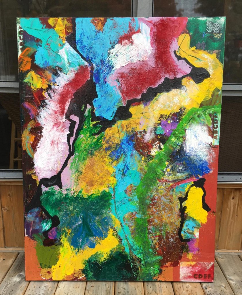 Donc j’ai corrigé, j’ai aussi préparé le terrain en fonction de l’hiver qui approche, mais préparé moins que je l’aurais voulu à cause des exigences du Tome 1 et maintenant du Tome 2. J’ai aussi peint, comme en atteste mon grand format représenté ci-dessus. Au moment d’insérer la photo dans mon texte, je me suis rendu compte que la toile n’a pas de titre, alors je me suis dit que je lui attribuerais le premier mot qui viendrait à mon esprit. Je n’avais pas fini de me dire cela qu’un mot s’imposait déjà, il s’agit de Vastitude.