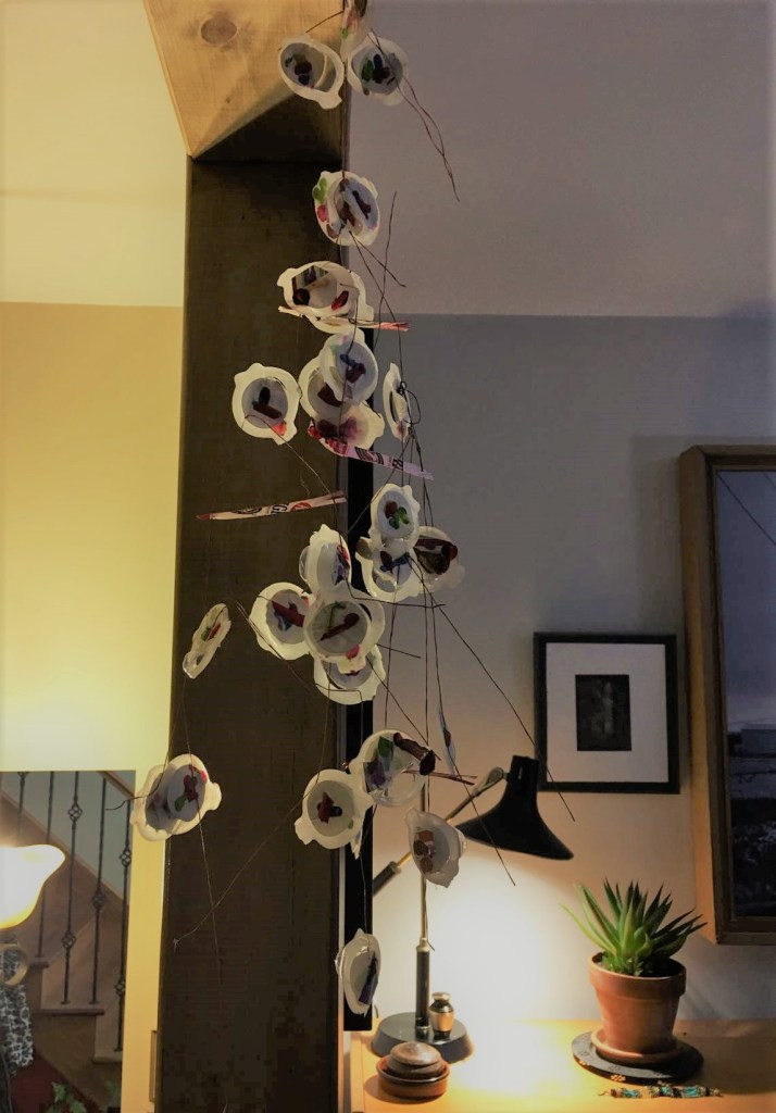 La photo ci-contre ne rend pas justice à l’élégance de mon mobile. Je l’ai fabriqué en retirant leur couvercle à des fioles de médicament. J’ai déposé çà et là des taches de couleur acrylique sur les couvercles et j’ai déposé des bouts de fil brun sur le tout, dans l’espoir que le fil devienne prisonnier du plastique fondu car j’ai mis ma mixture au four. Emmanuelle a fait l’équivalent à la garderie quand elle avait quatre ans, sous la supervision de son éducatrice bien entendu. J’ai fait cette oeuvre ultime en ne cessant d’entendre des airs de Céline/Aline dans ma tête, je me demande bien pourquoi.