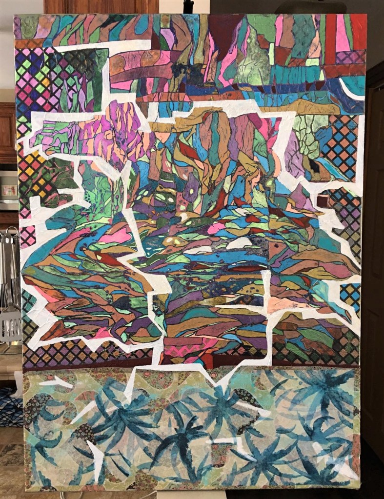 Après avoir colorié pas mal, je m’étais rendu compte que le format de la toile était trop grand. En d’autres mots, mon envie de remplir des masses s’était assouvie avant que je réussisse à couvrir la surface entière. Je m’étais par conséquent rabattue sur des serviettes de table en papier, mes amies fidèles, sur lesquelles sont imprimées des sortes de méduses de couleur turquoise, comme en atteste la portion inférieure ci-contre.