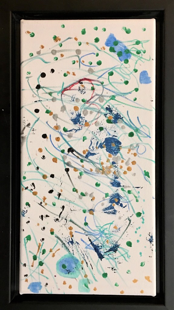 Cela ne me tentait pas de montrer au personnel du magasin ce que j’aurais peint, car je pressentais que ce ne serait pas intéressant. Alors, quand ma petite-fille m’a demandé si elle pouvait peindre sur une des nombreuses toiles vierges qui encombrent mon bureau, je me suis empressée de lui tendre celle qui vient avec son cadre métallique.