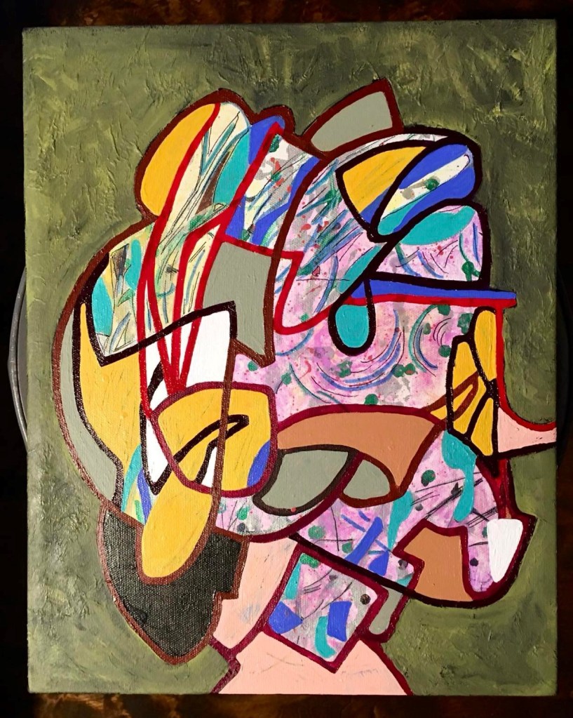 Pauvres taches ! On ne les voit presque plus tellement j’ai effectué d’entourloupettes pour tendre vers un résultat. Mon projet initial était de créer un deuxième niveau de sens sur le fond peinturluré par la fillette, de manière à pouvoir dire que nous avions fait une oeuvre commune.
