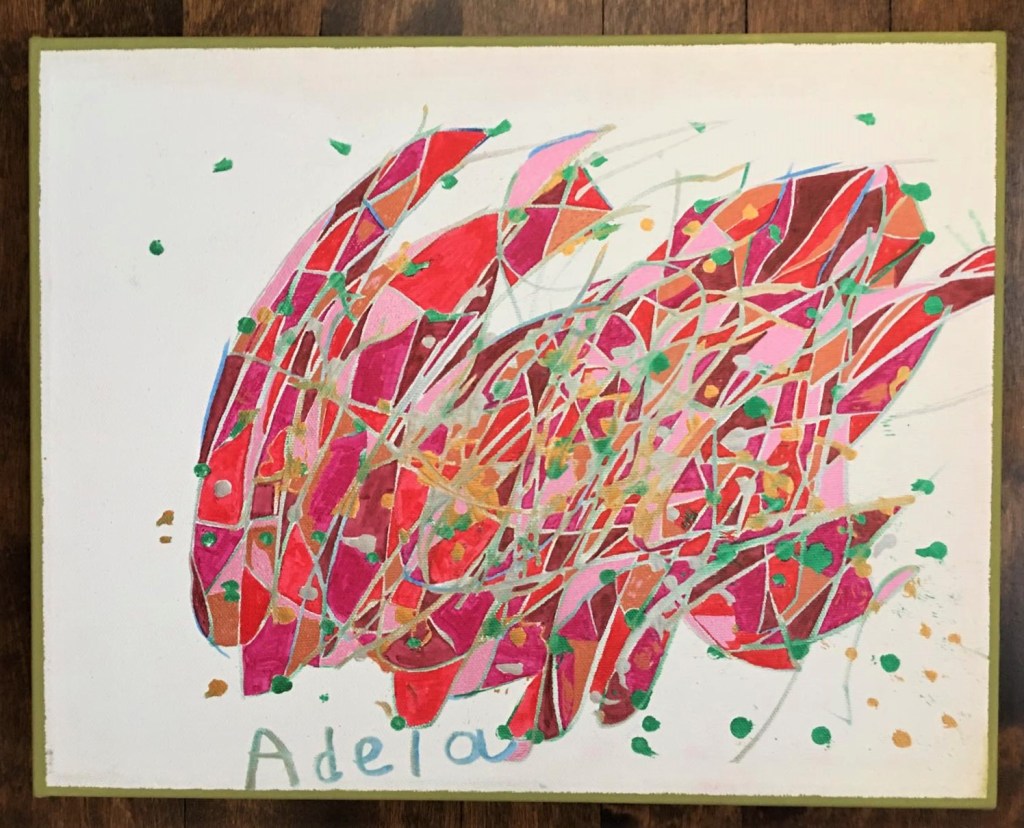 Ci-contre, on perçoit bien la participation des deux artistes, à savoir mademoiselle de six ans et moi-même, soixante-deux. Les lignes grises et dorées ont été tracées avec beaucoup d’entrain par ma collaboratrice, de même que les points. Les formes obtenues par le croisement des lignes, quant à elles –losanges, triangles et autres polygones–, ont été remplies par nulle autre que moi, la sempiternelle maniaque des masses de toutes sortes.