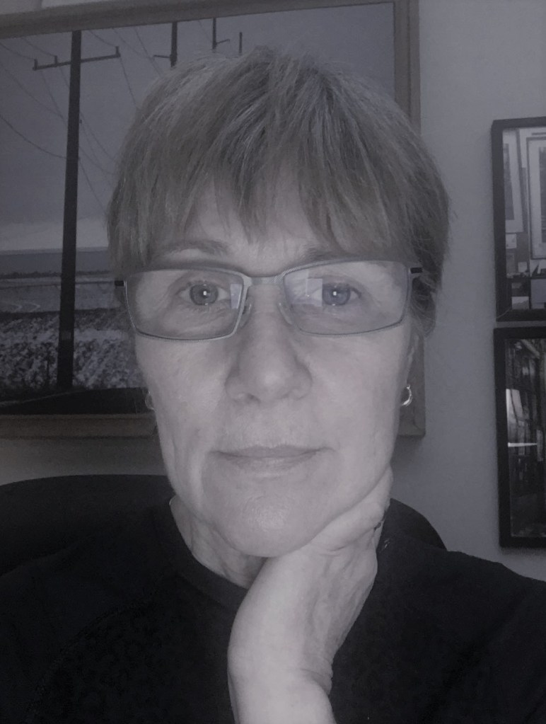 Derrière moi, la photo en très grand format d’un paysage de l’état de Washington où je me suis trouvée lorsque, avec Denauzier, nous sommes partis du Québec en avion, en direction de la côte ouest, pour revenir en camion. Ma tête cache la portion principale de la photo, à savoir une route de campagne sur laquelle roulent trois véhicules. La route se déroule tel un ruban qui monte et descend dans cet environnement vallonné.