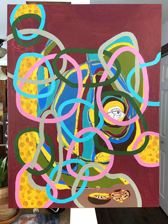 Voici ma quatrième Encerclée. Il ne me vient rien de bien intelligent en tête pour la commenter. Je l’ai peinte en écoutant en boucle La vertu des impondérables de Claude Lelouch. Depuis hier soir, le film a joué quatre fois. En ce moment, l’image est sur Pause, à l’écran de la télévision, et je compte aller le savourer à nouveau, en cinquième fois, lorsque j’aurai écrit ce texte.