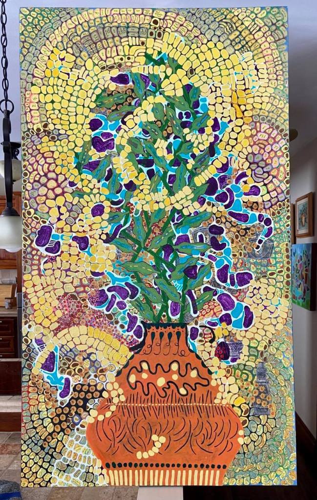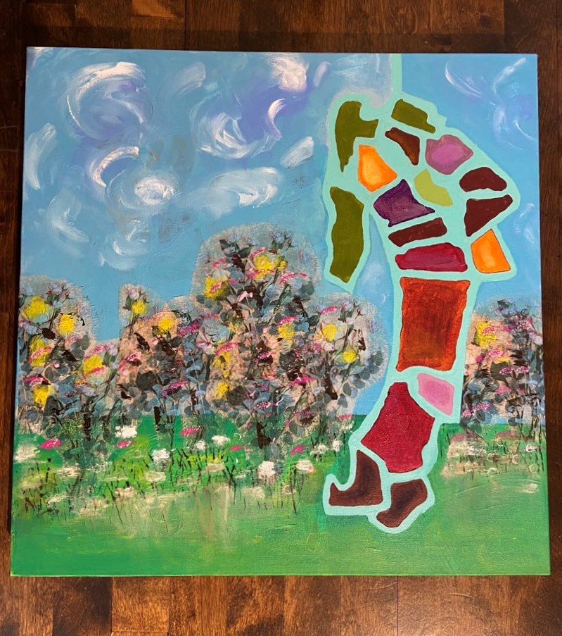 Je n’ai rien à exprimer, c’est la raison pour laquelle je ne publie guère ces derniers temps. Mais ne pas publier, c’est le meilleur moyen de ne plus être capable de me brancher à WordPress, parce que j’aurai oublié mon mot de passe, ou pour quelque raison que je n’anticipe pas. Alors, pour demeurer dans le bal des utilisateurs de technologie, j’écris aujourd’hui cette cent deuxième badouzienne, utilisant le prétexte d’une mise en ligne de ma nouvelle toile. En fait, c’est une ancienne toile que j’ai transformée. Les arbrisseaux manquent de précision, je ne sais pas encore si je les aime. J’aime le titre en tout cas. Et le personnage qui s’est créé de lui-même.