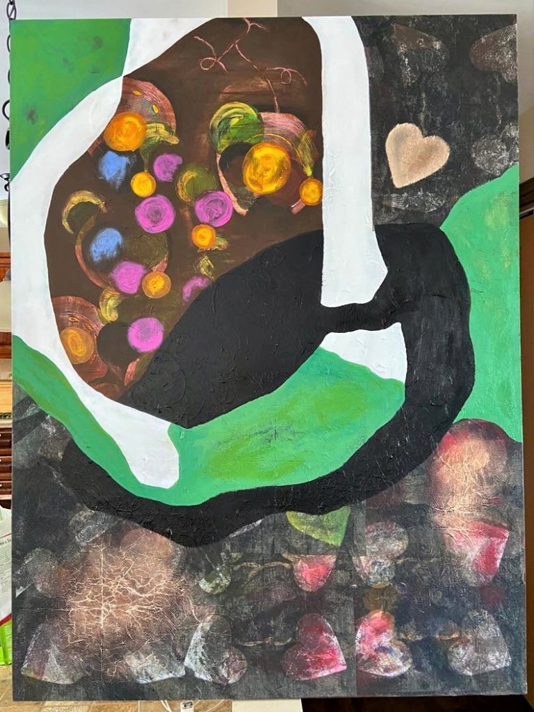 Donc, je peins, en constatant chaque jour à quel point je suis limitée, à quel point j’atteins vite mes limites. Il est possible que je ne transporte pas mon équipement de peinture au chalet cet été. Je vais plutôt lire, et tricoter un très long foulard pour notre inuksuk. Il m’a dit avoir eu froid cet hiver. Je ne suis pas surprise, il n’avait pour se vêtir qu’un foulard de tissu glissant provenant d’un vieux rideau de douche dont Emmanuelle voulait se débarrasser.