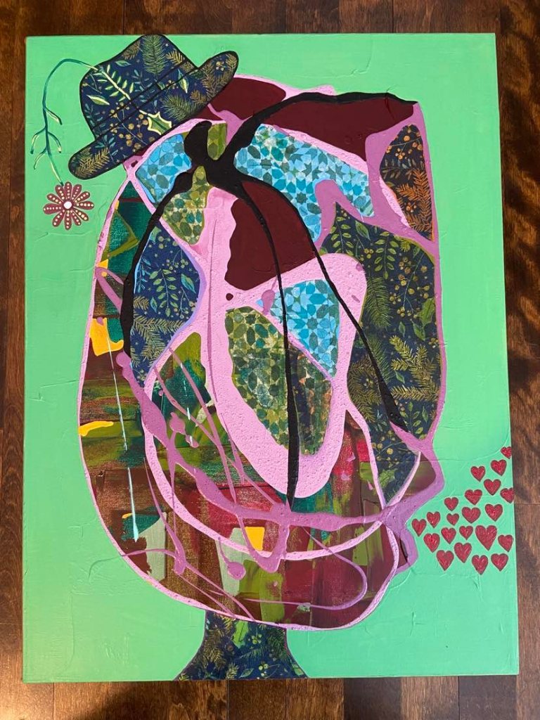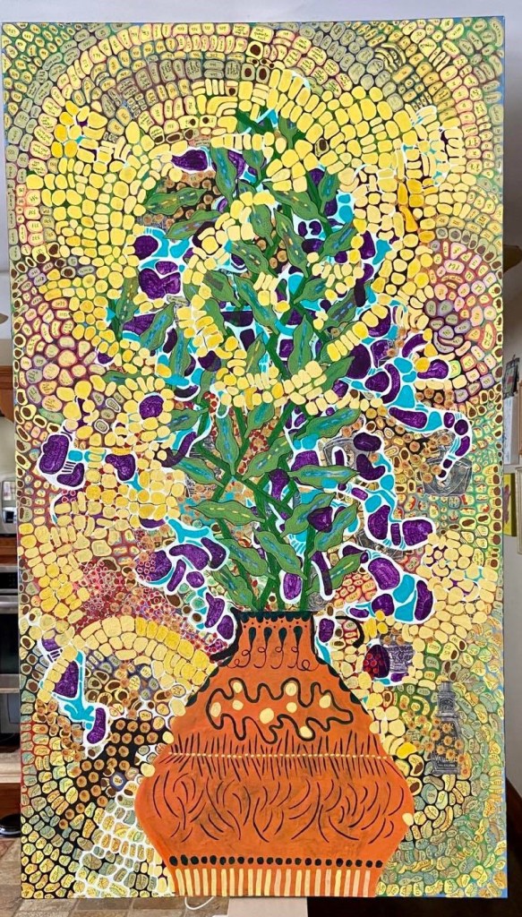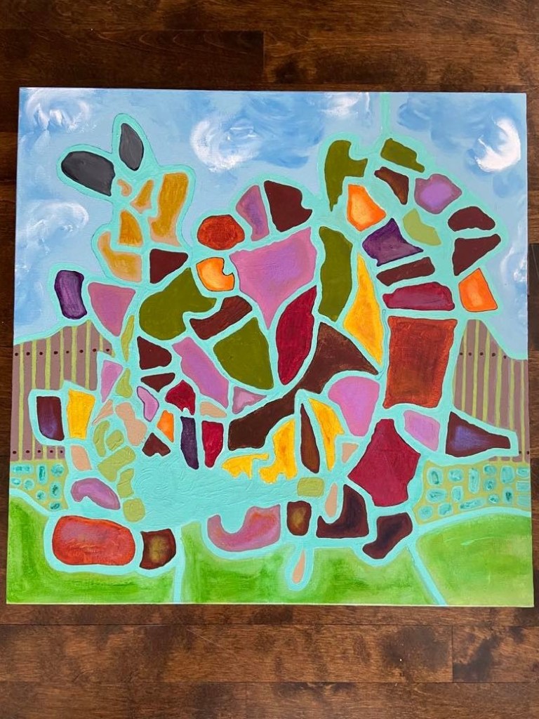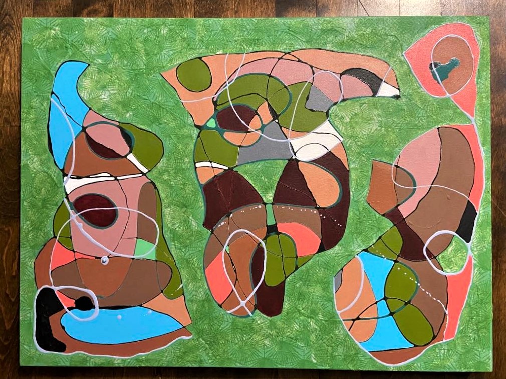 Récemment, j’ai couvert le fond blanc d’une sorte de vert forêt, en incluant les côtés, qui n’apparaissent pas sur la photo. L’ajout de cette couleur dynamise un peu l’ensemble. J’ai aussi pensé que si plus de vert ayant servi à couvrir le fond venait aussi couvrir quelques formes intérieures, j’obtiendrais deux ou trois masses séparées les unes des autres. Cette séparation procurerait peut-être un effet de respiration.
